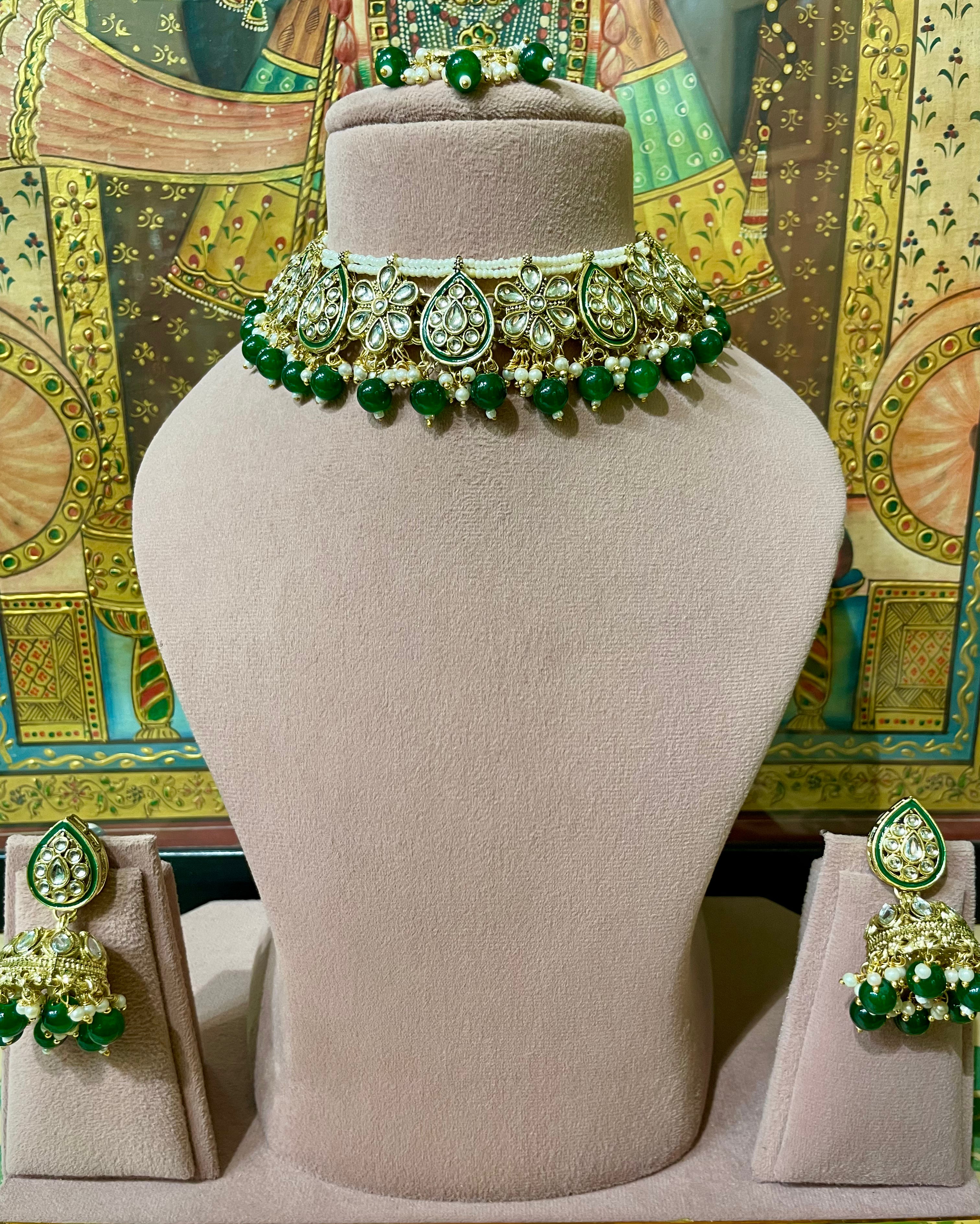 GREEN FLORAL KUNDAN GOLD PLATED JHUMKI NECKLACE SET