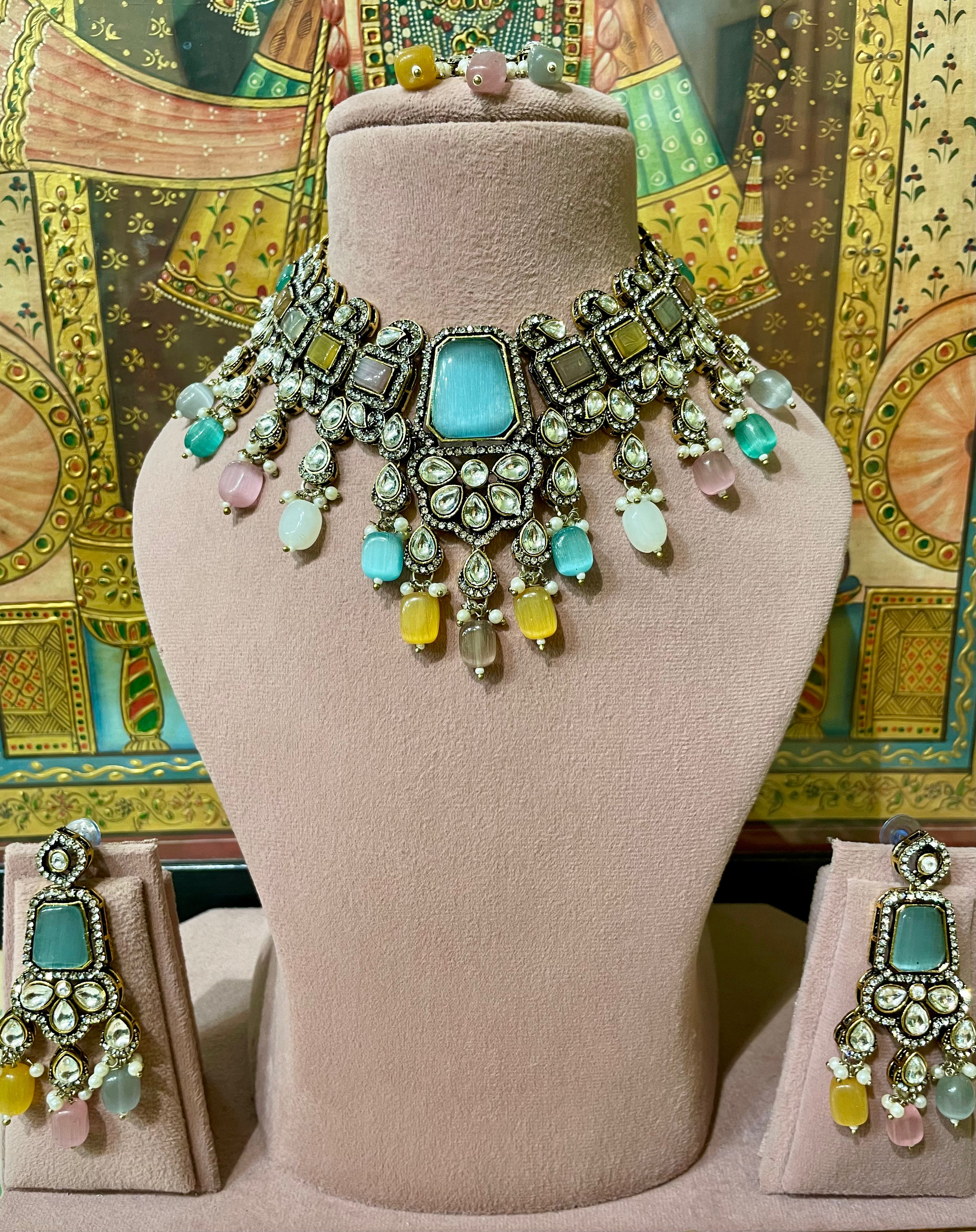 MULTI COLOUR MOISSANITE KUNDAN MODERN BRIDAL NECKLACE SET