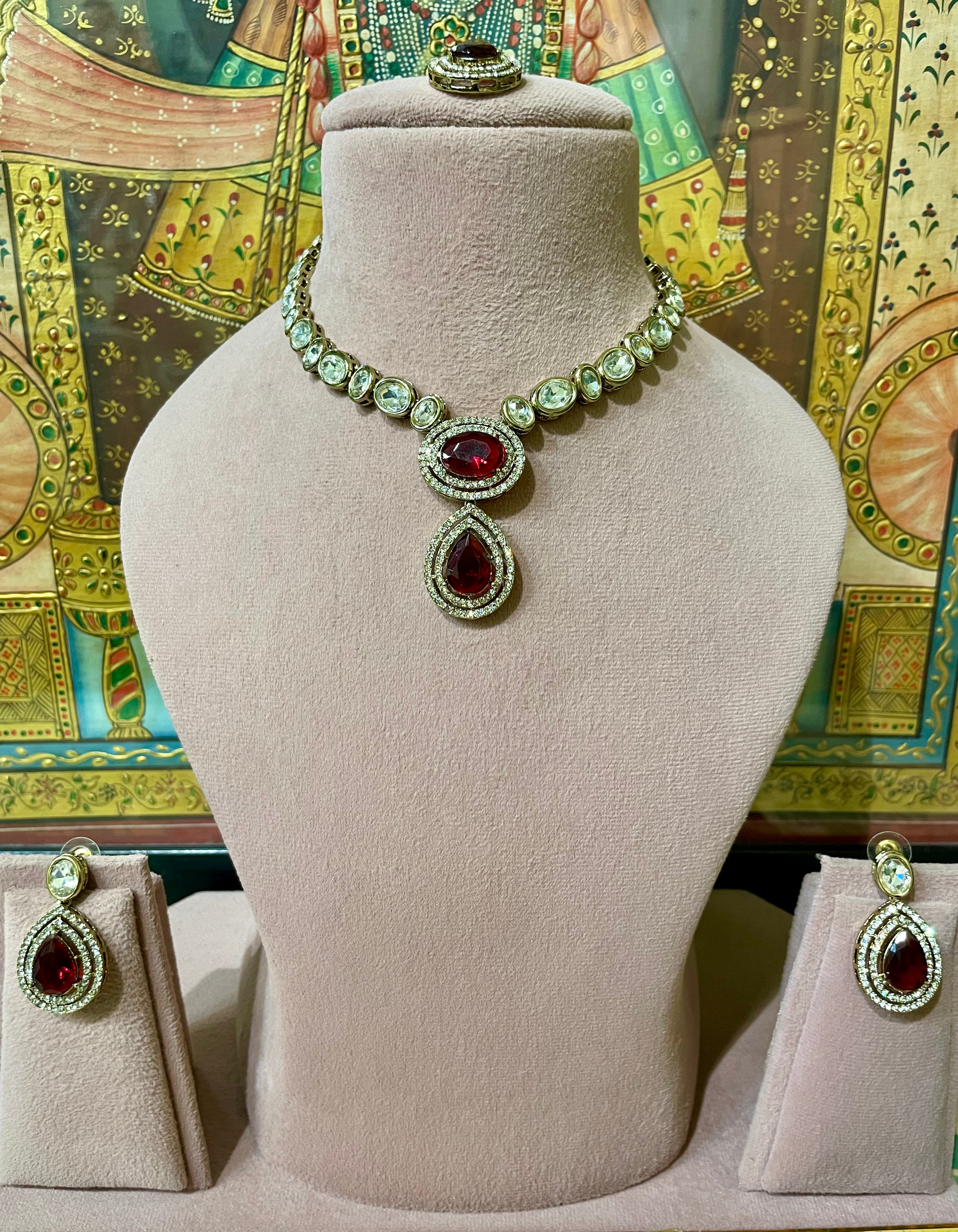 RUBY RED KUNDAN MOISSANITE PENDANT NECKLACE SET