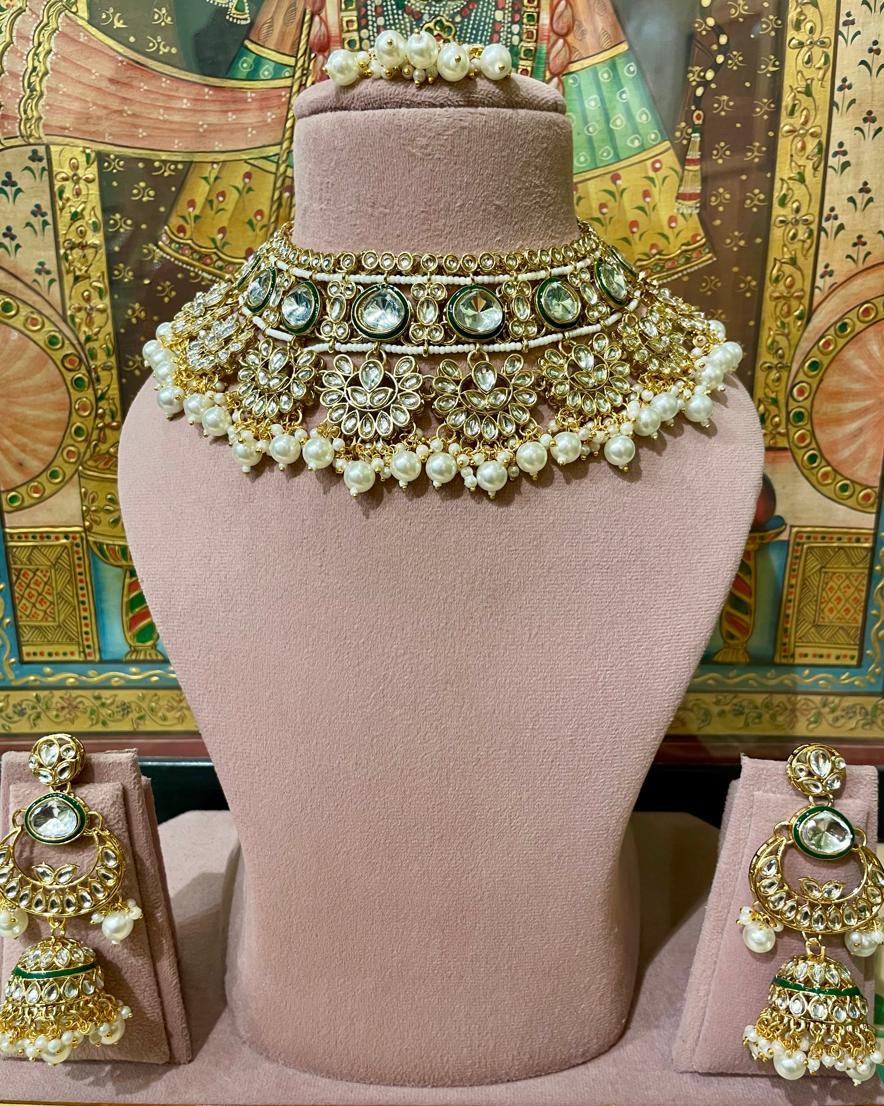 IVORY WHITE GOLD PLATED KUNDAN BRIDAL JHUMKI NECKLACE SET