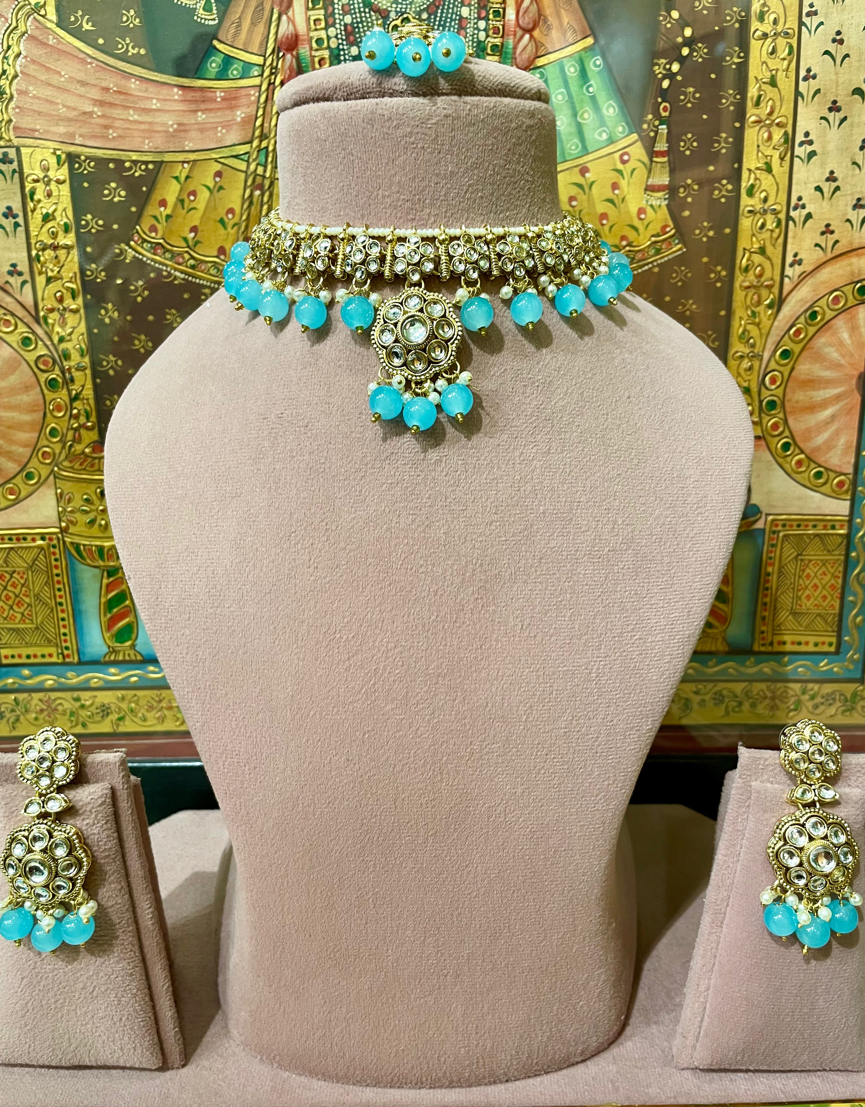 SKY BLUE GOLD PLATED KUNDAN PENDANT NECKLACE SET
