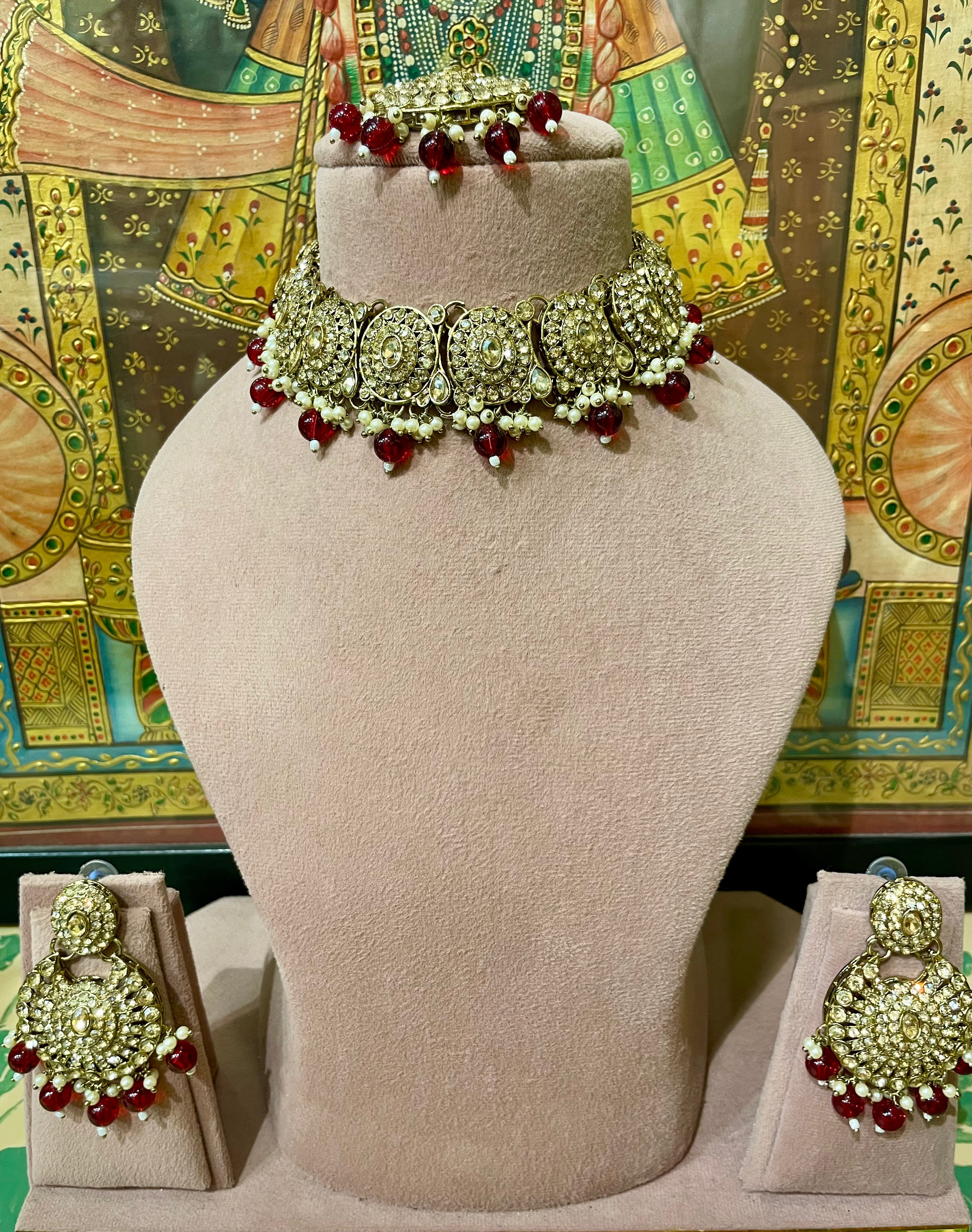 MAROON GOLD TONED ROUND TUKRI CHOKER NECKLACE SET