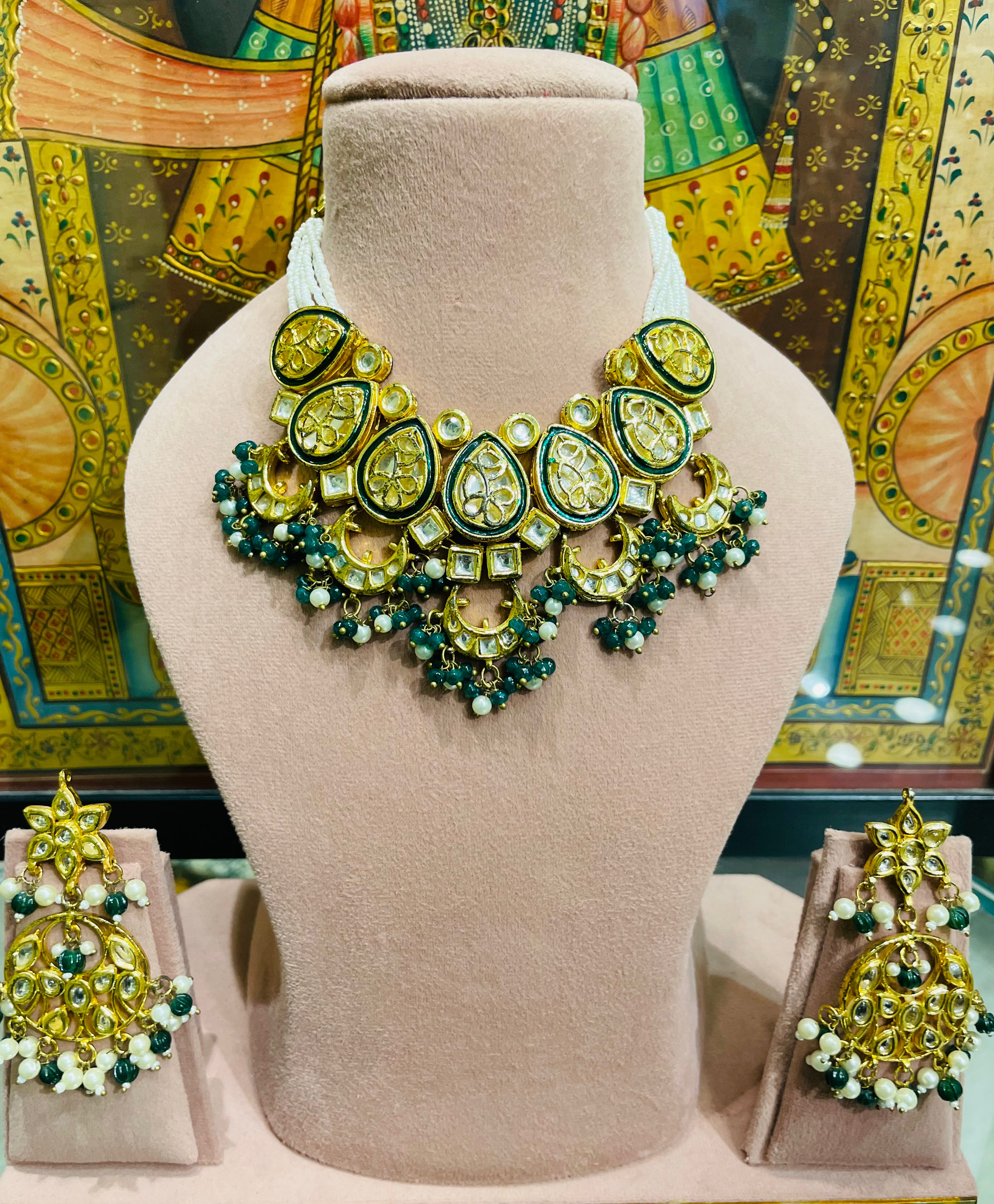 GOLD TONED KUNDAN MUGHAL NECKLACE SET (GREEN)