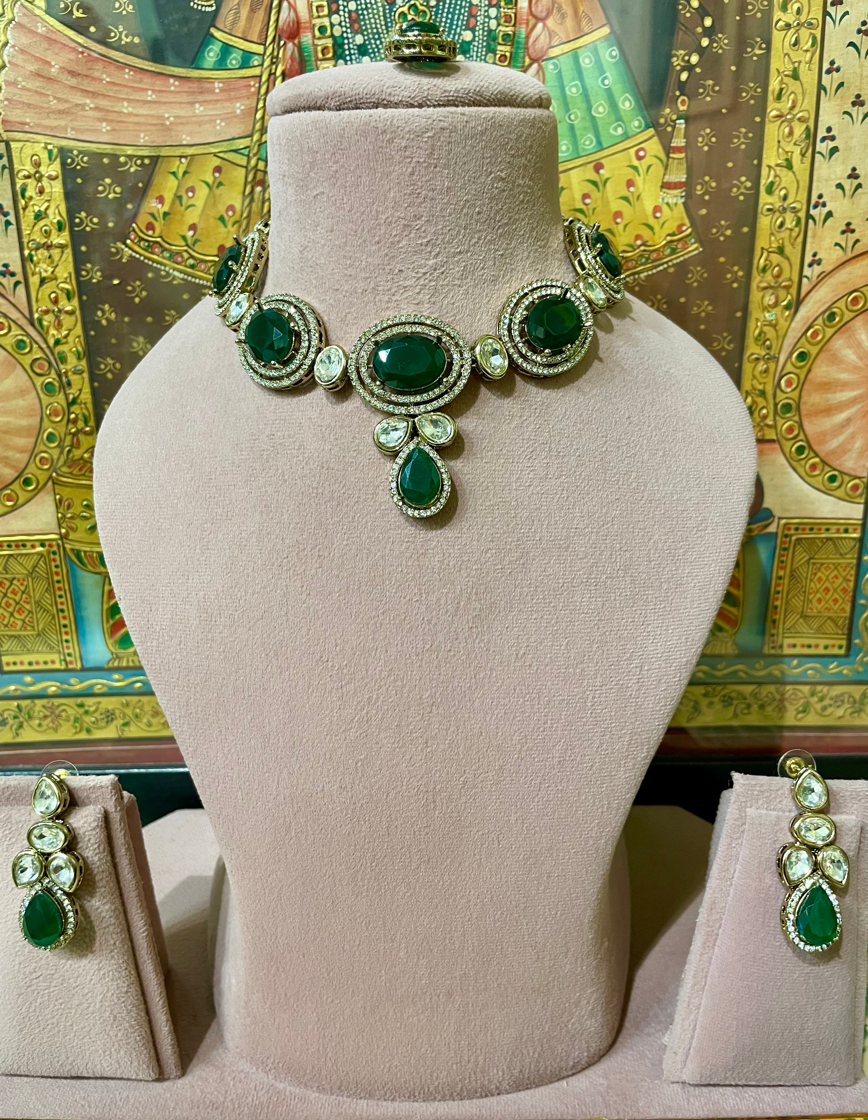 GREEN KUNDAN MOISSANITE MONALISA DESIGNER NECKLACE SET