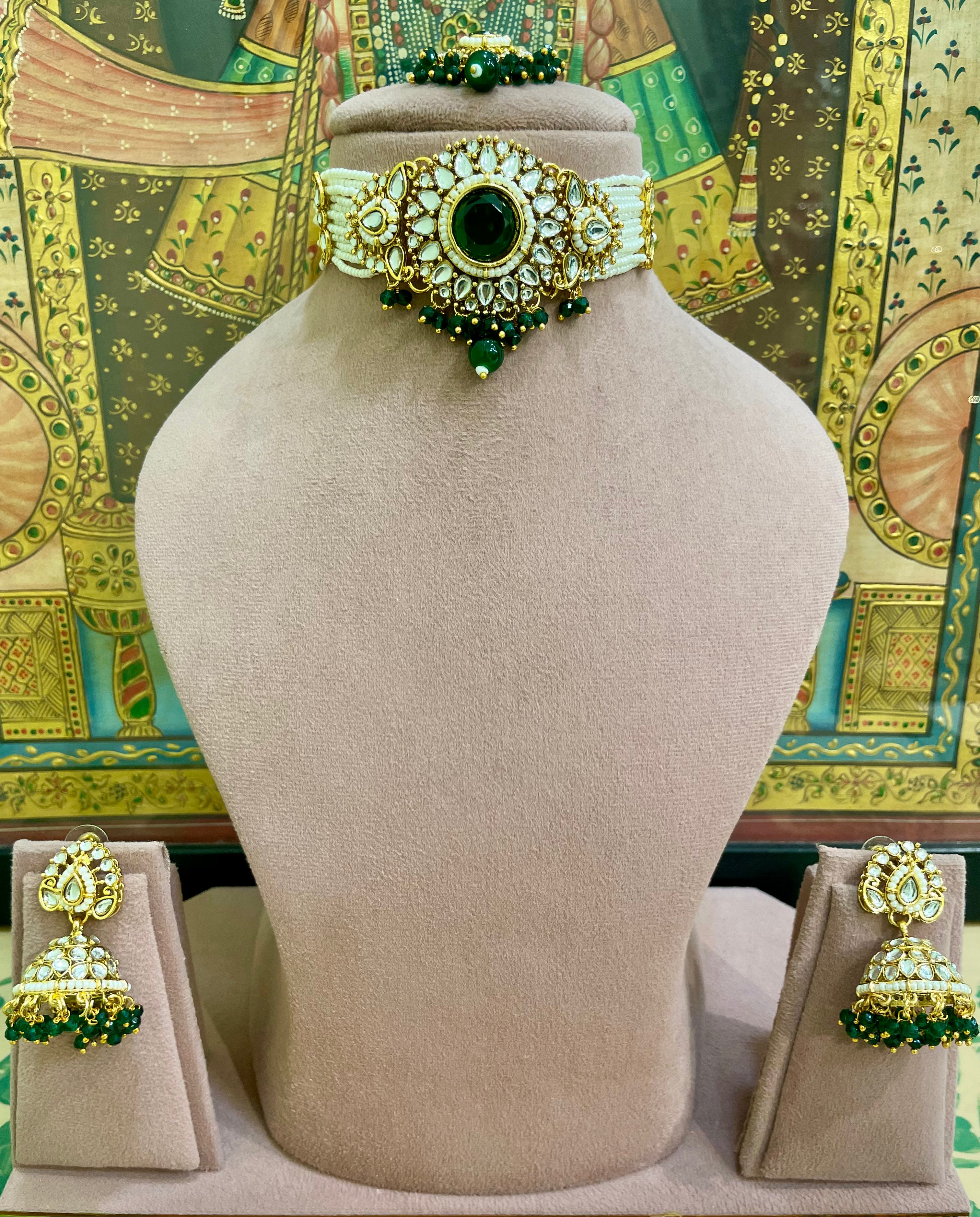 GREEN KUNDAN PEARL ROYAL CHOKER SET