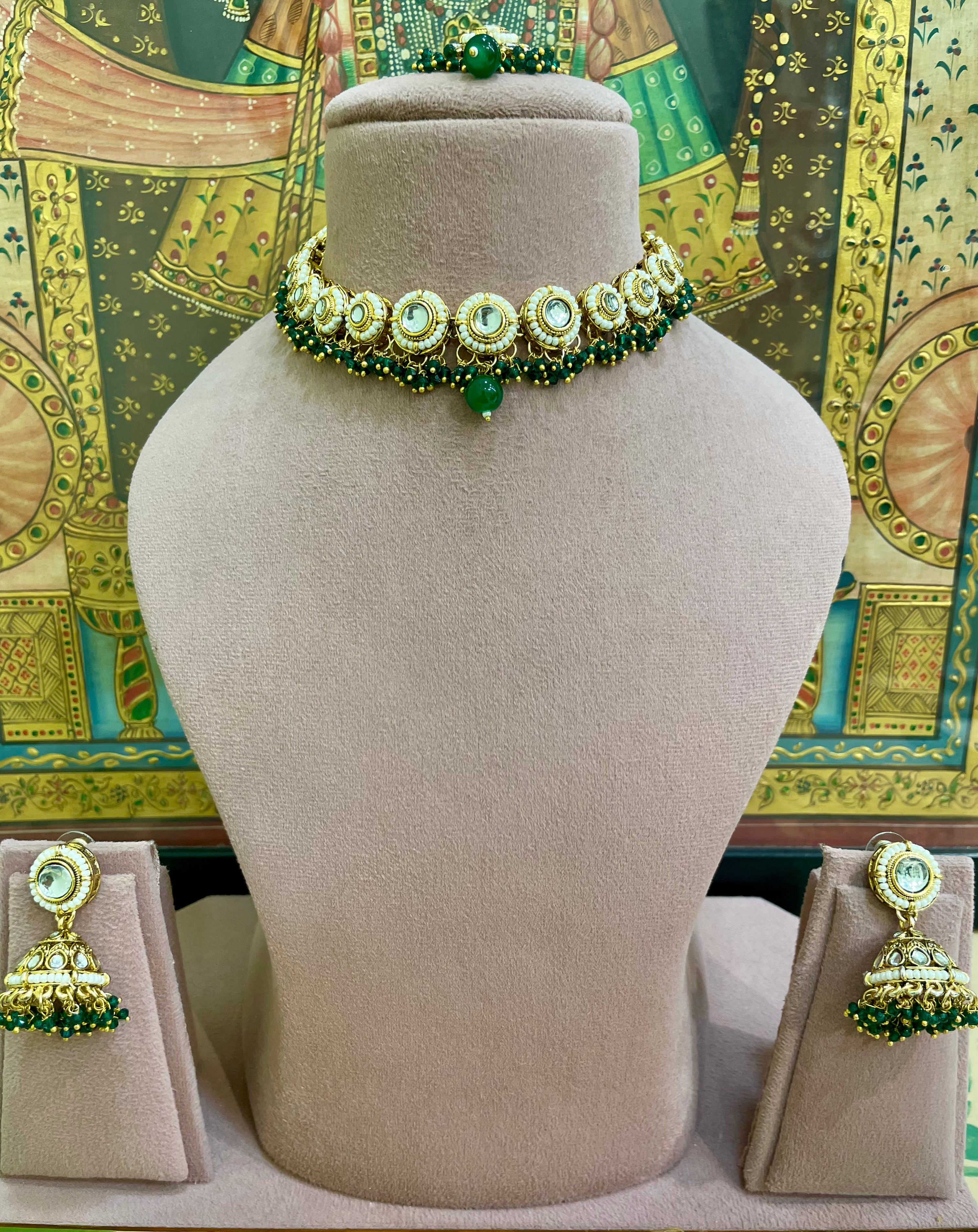 GREEN KUNDAN ROUND PEARL GOLD PLATED CHOKER SET