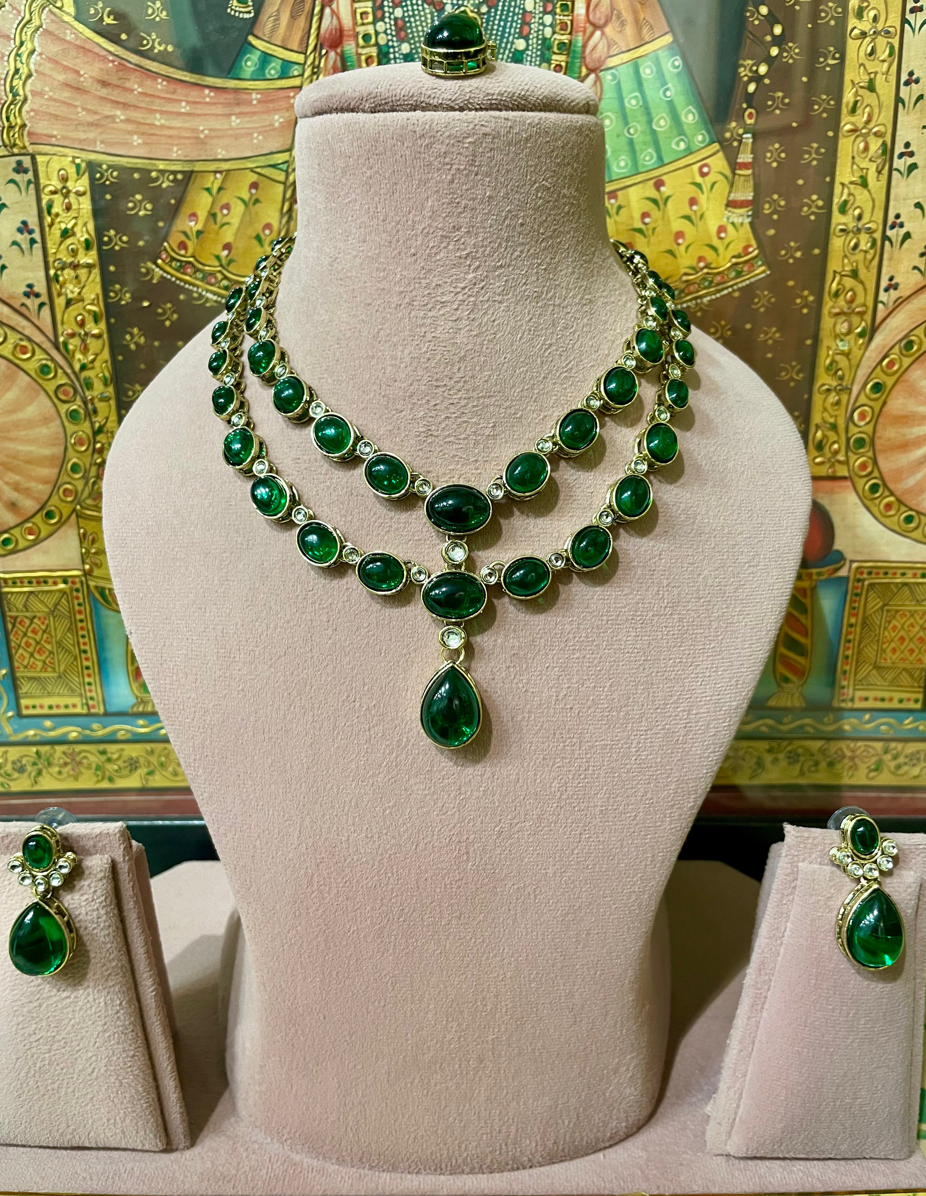 GREEN MONALISA STONE DOUBLE LAYER NECKLACE SET
