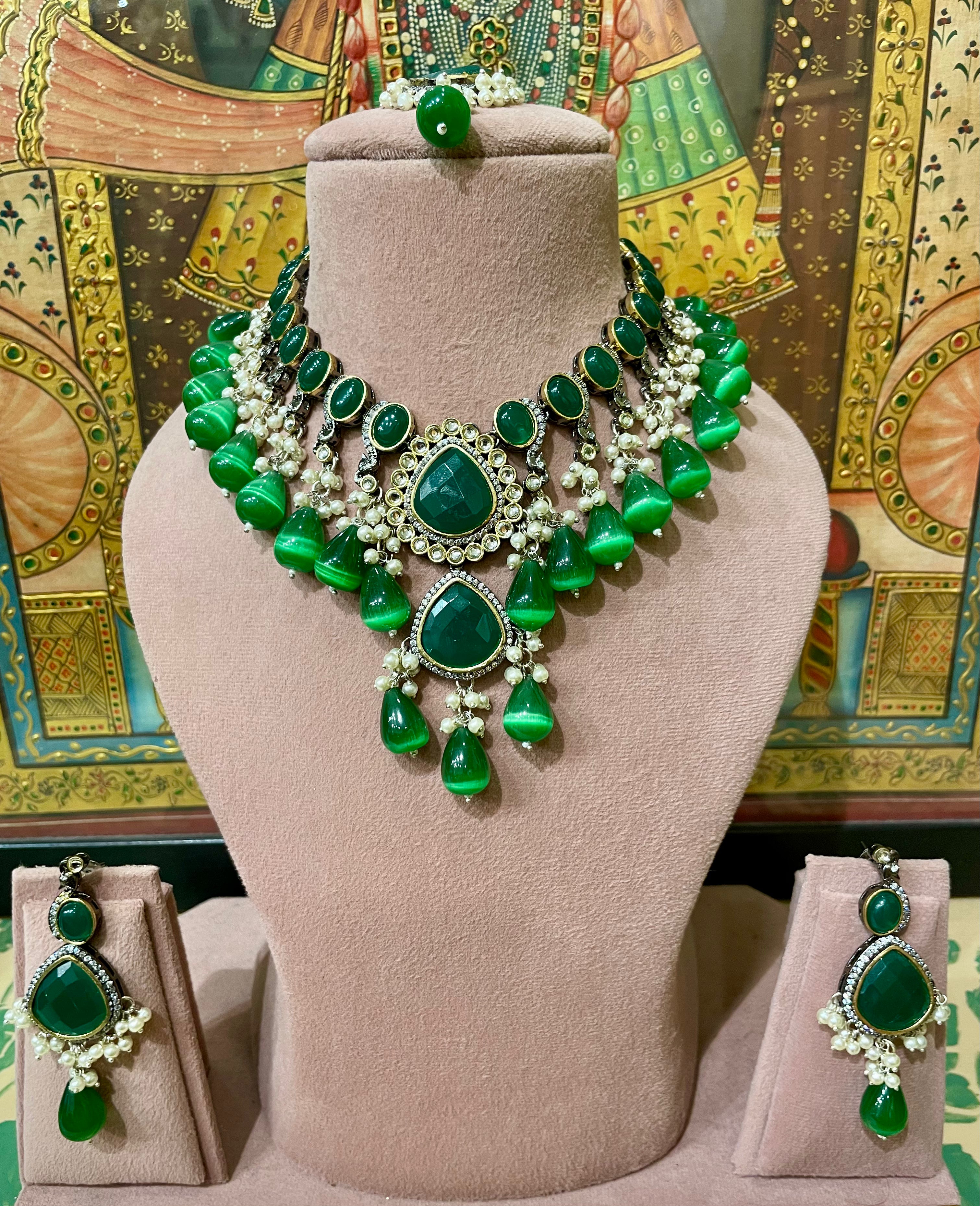 GREEN MONALISA STONES POLKI NECKLACE SET