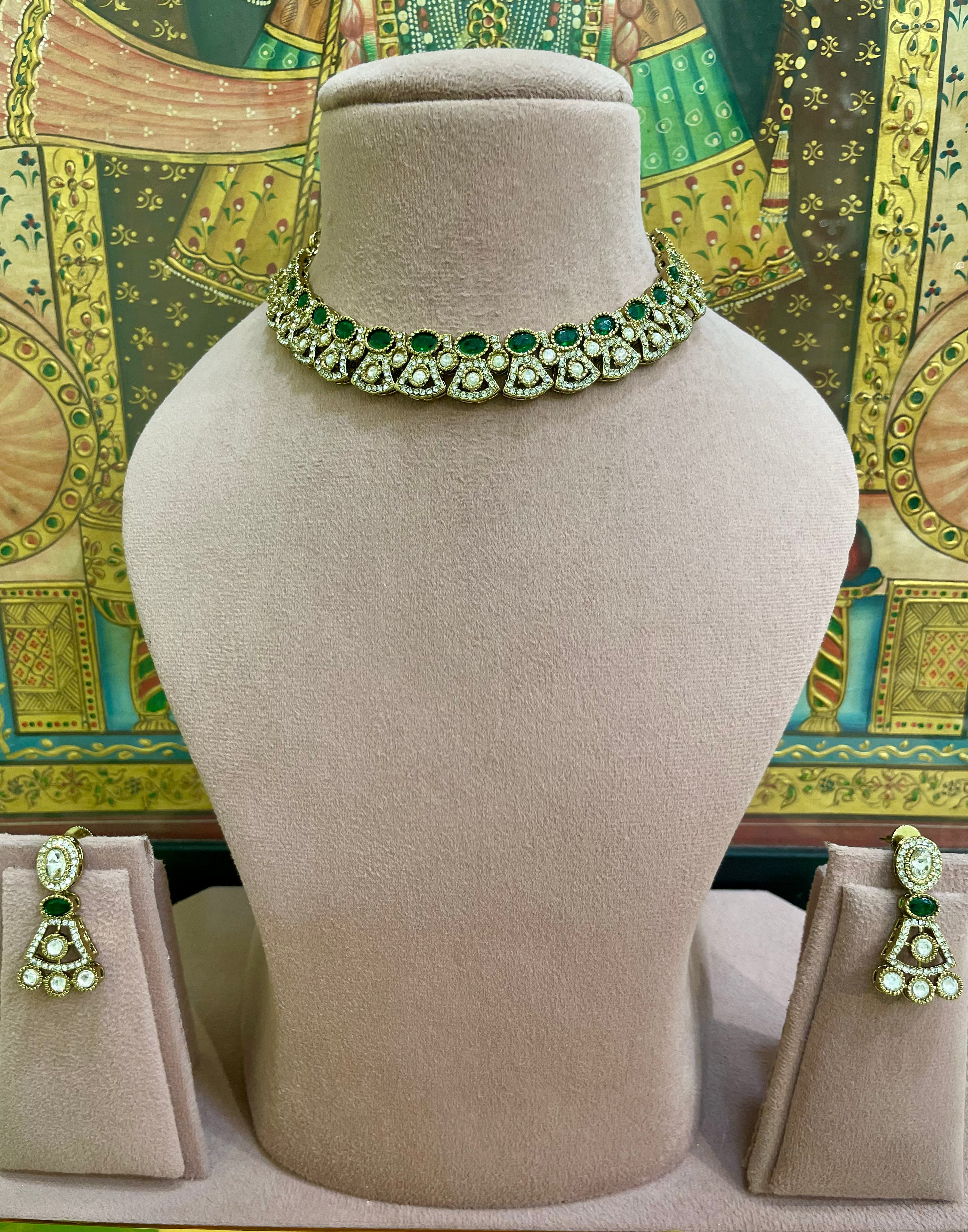 GREEN TRADITIONAL POLKI SLEEK NECKLACE SET