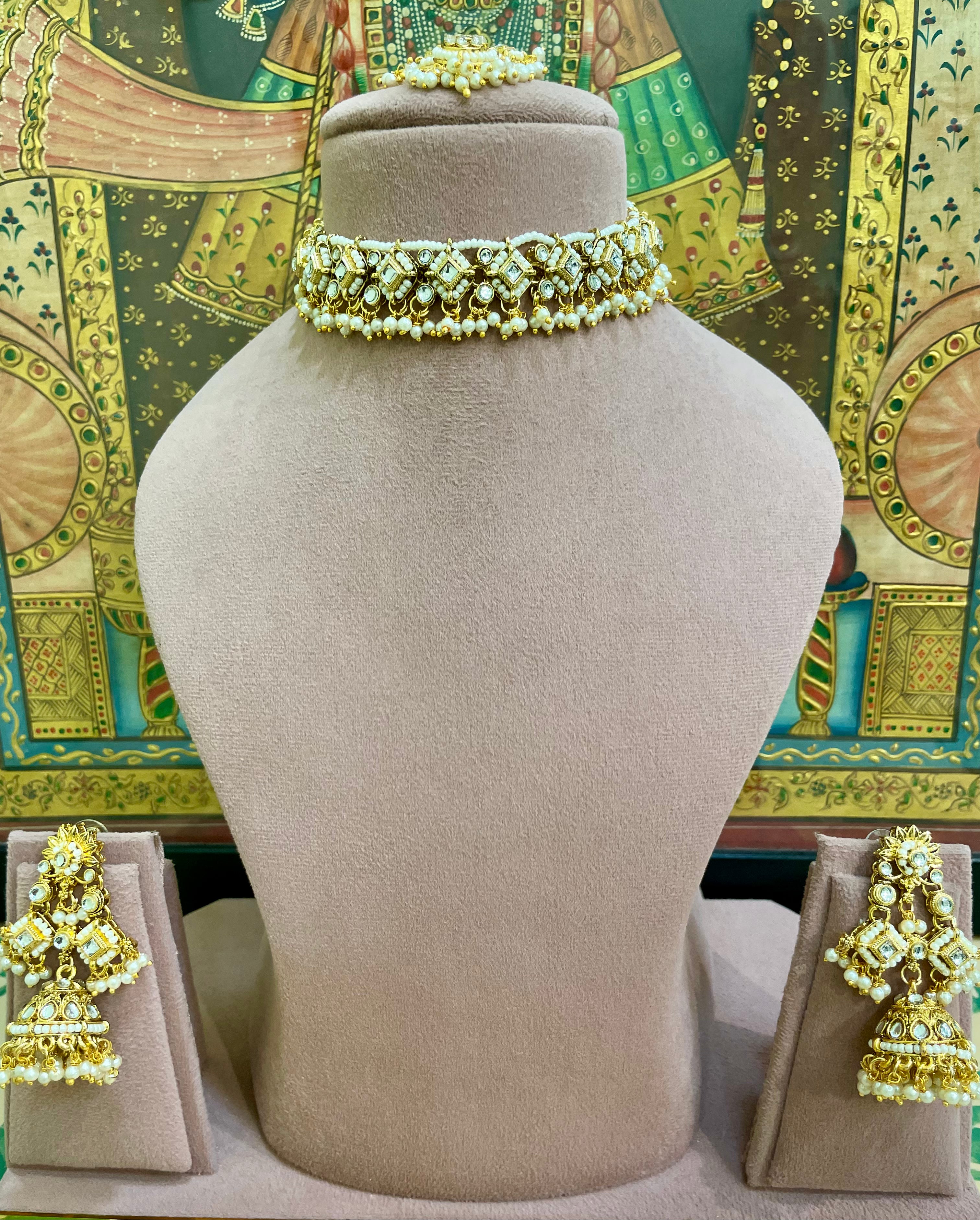 IVORY WHITE KUNDAN PEARL GOLD PLATED JHUMKA CHOKER SET