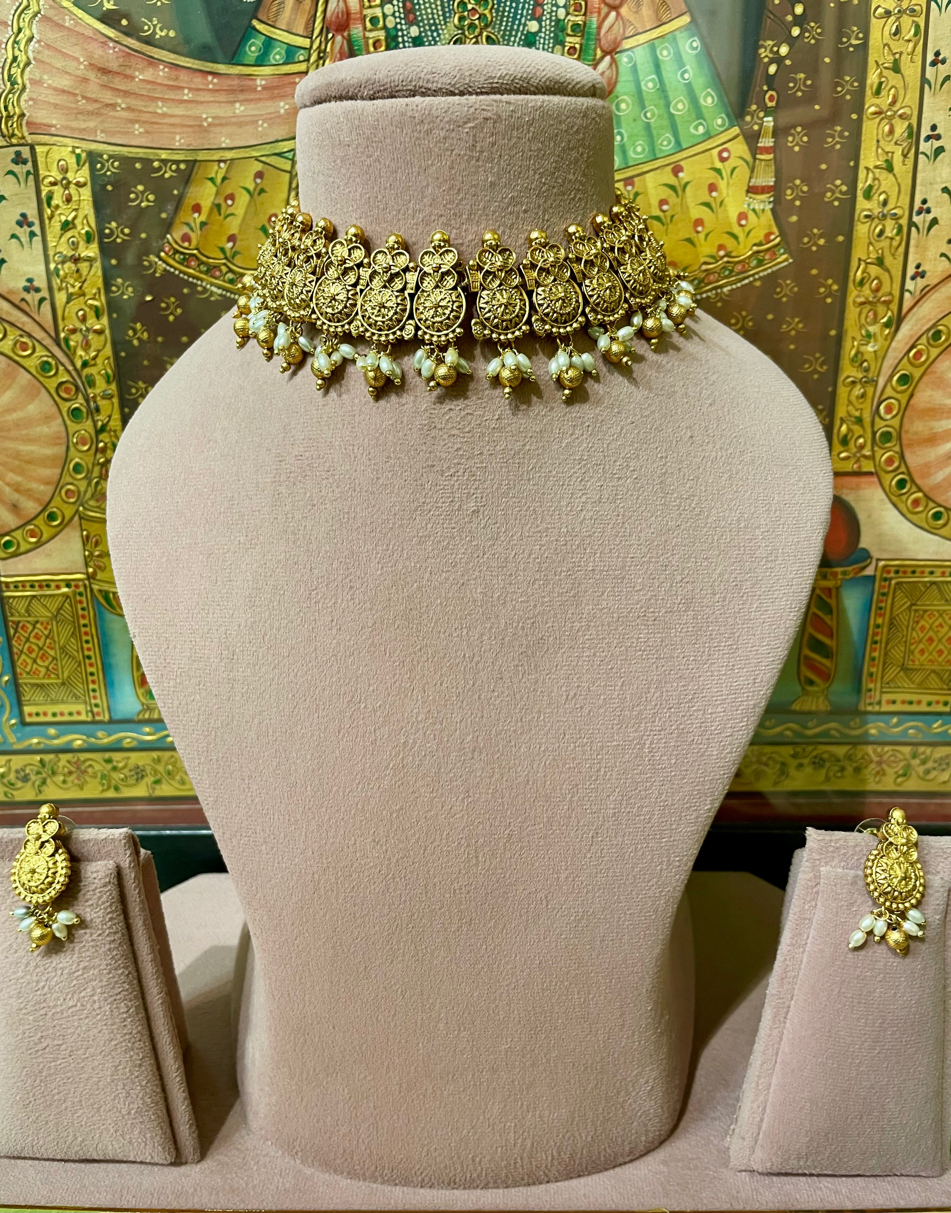 IVORY WHITE PEARL GOLD PLATED TRADITIONAL SOUTH INDIAN SET