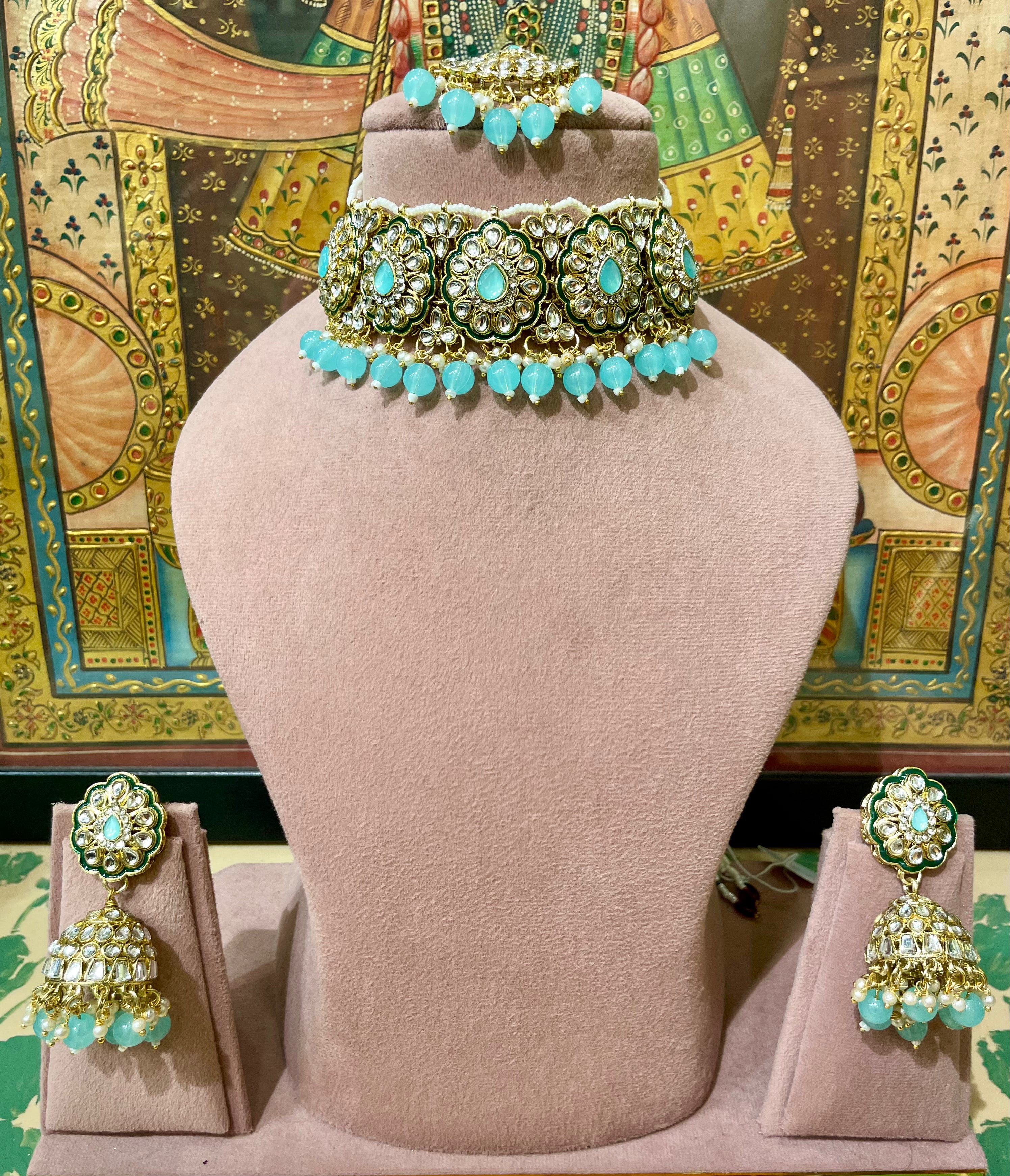 KUNDAN POLKI TURQUOISE CHOKER NECKLACE SET