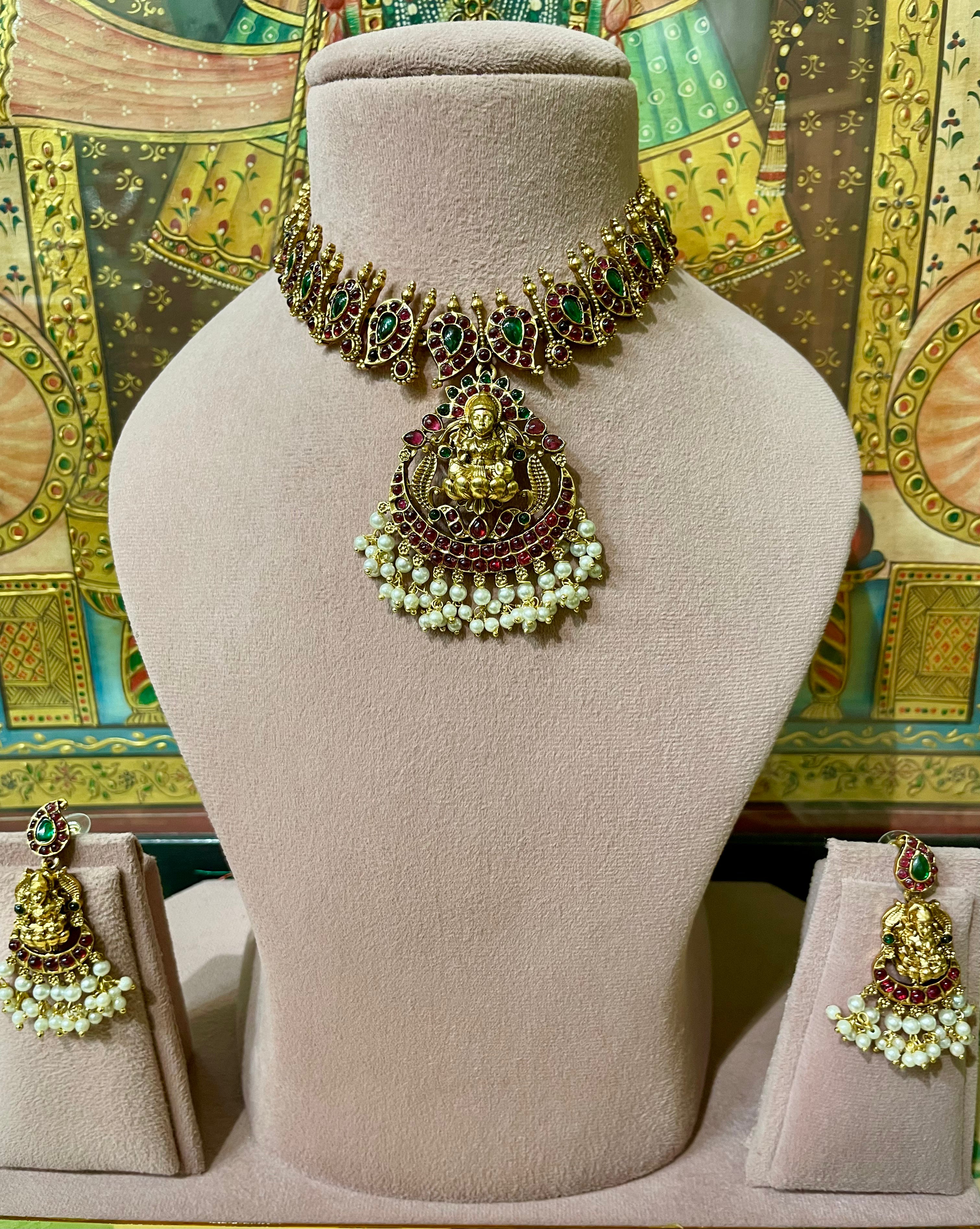 MA LAXMI ANTIQUE KEMP STONES TEMPLE SOUTH INDIAN PENDANT SET