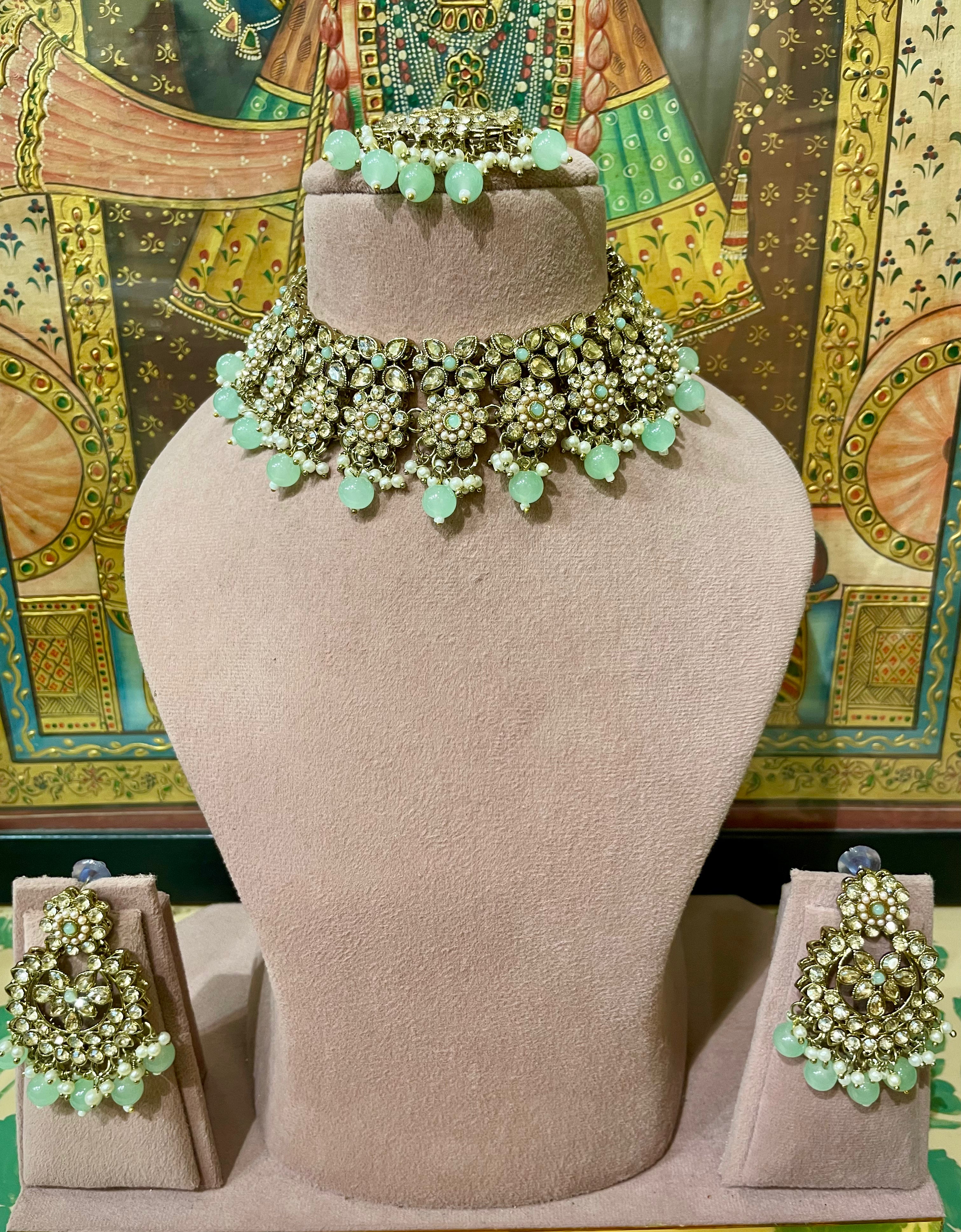 MINT GREEN DESIGNER GOLD TONED PEARL FLORAL CHOKER NECKLACE SET