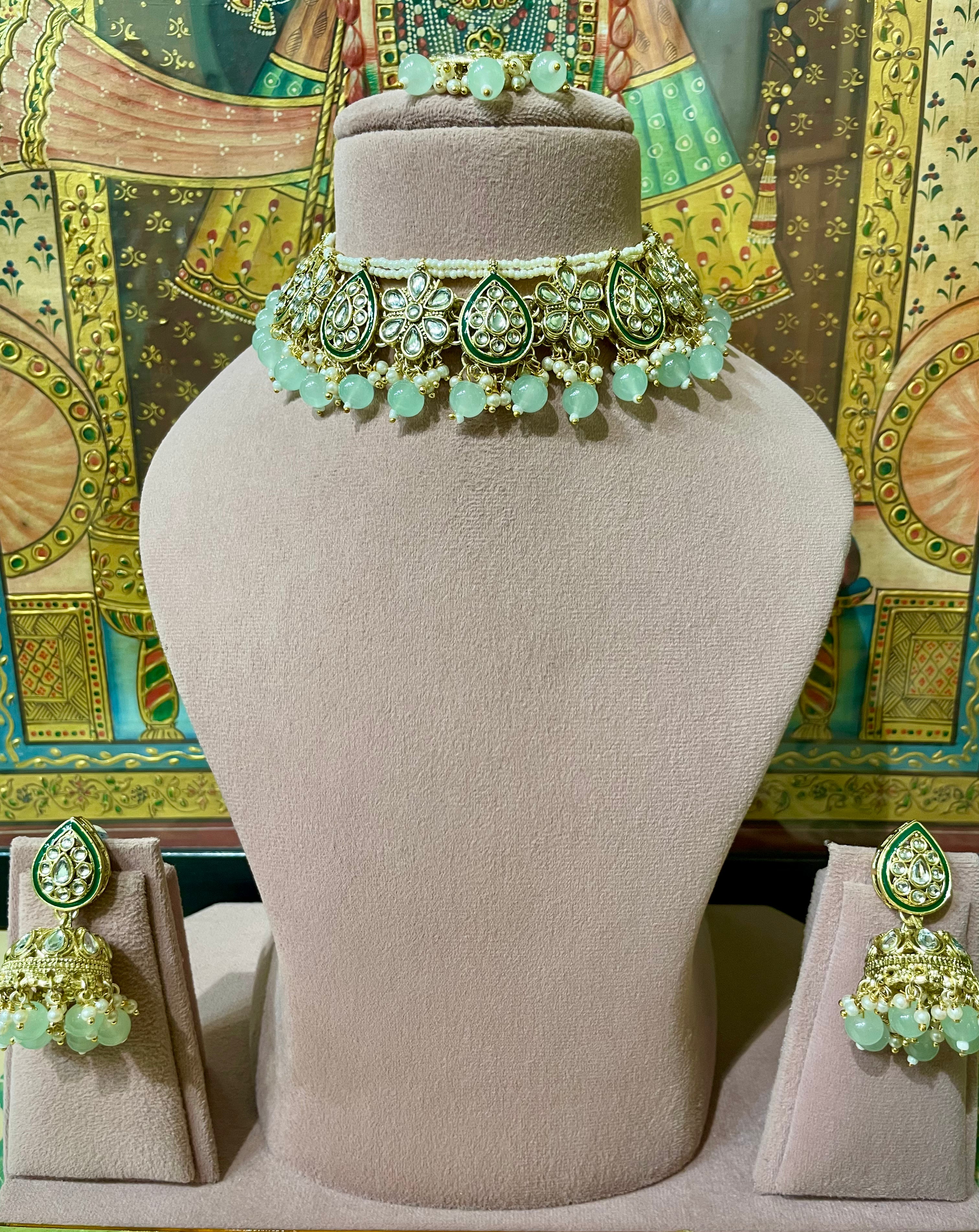 MINT GREEN FLORAL KUNDAN GOLD PLATED JHUMKI NECKLACE SET