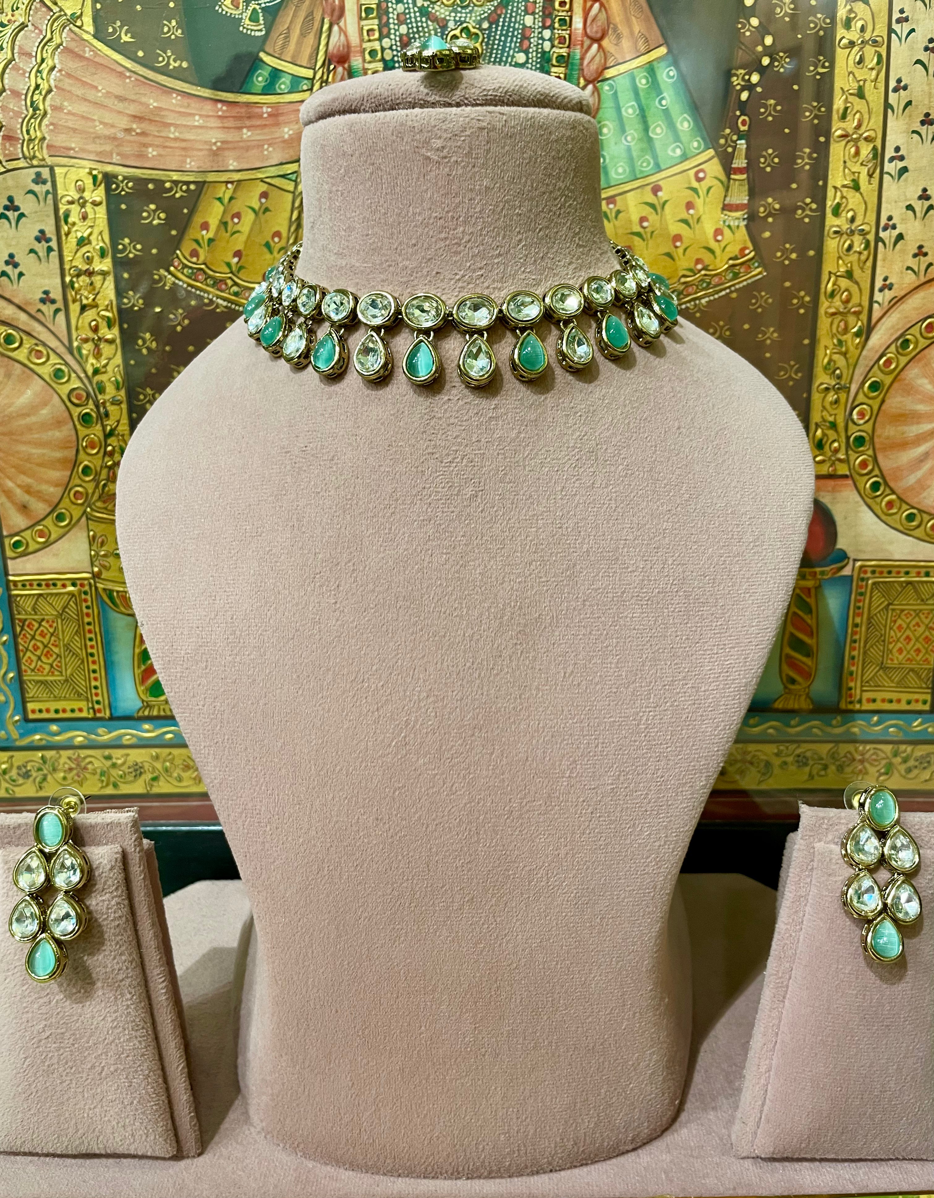 MINT GREEN GOLD PLATED KUNDAN DESIGNER NECKLACE SET