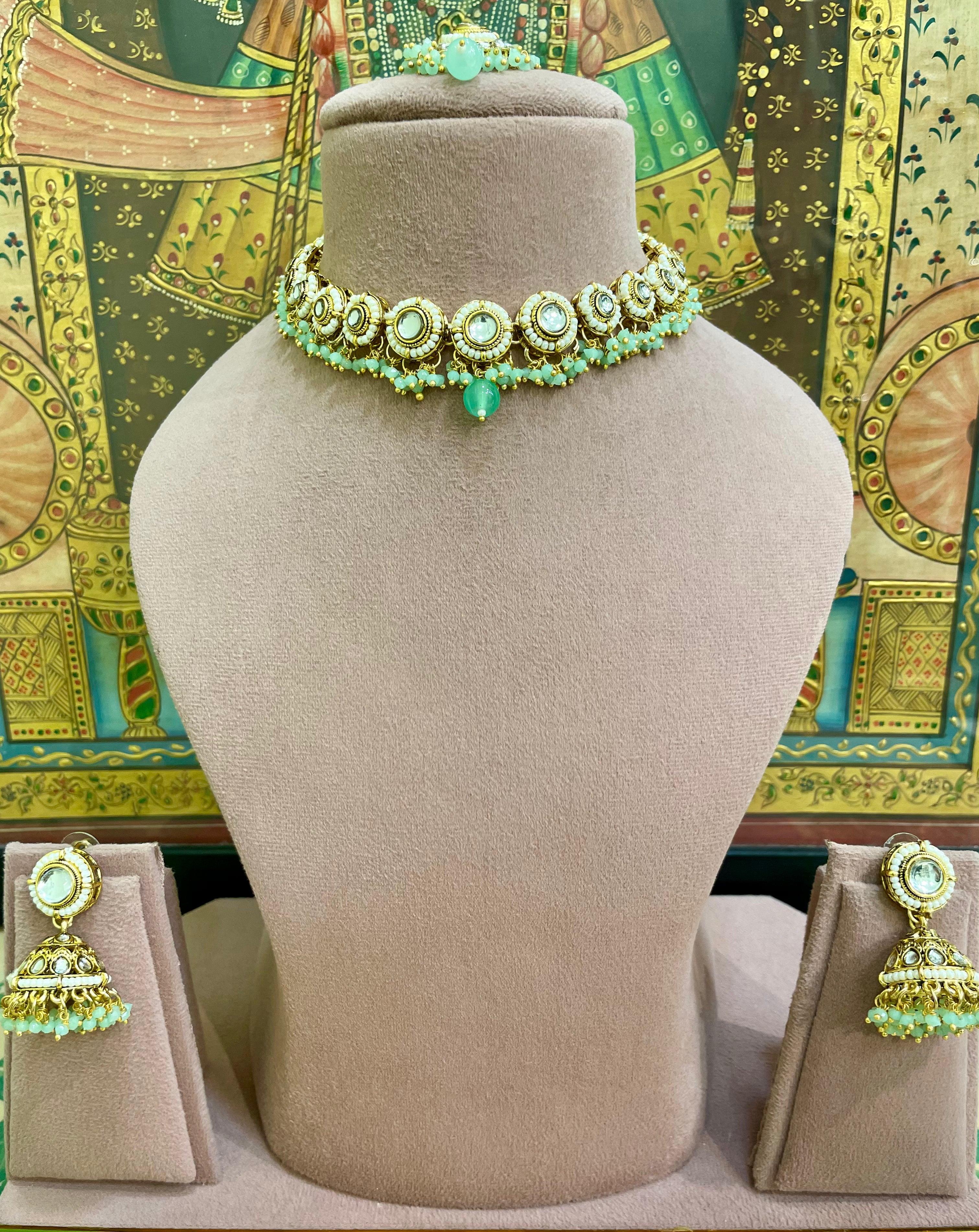 MINT GREEN KUNDAN ROUND PEARL GOLD PLATED CHOKER SET