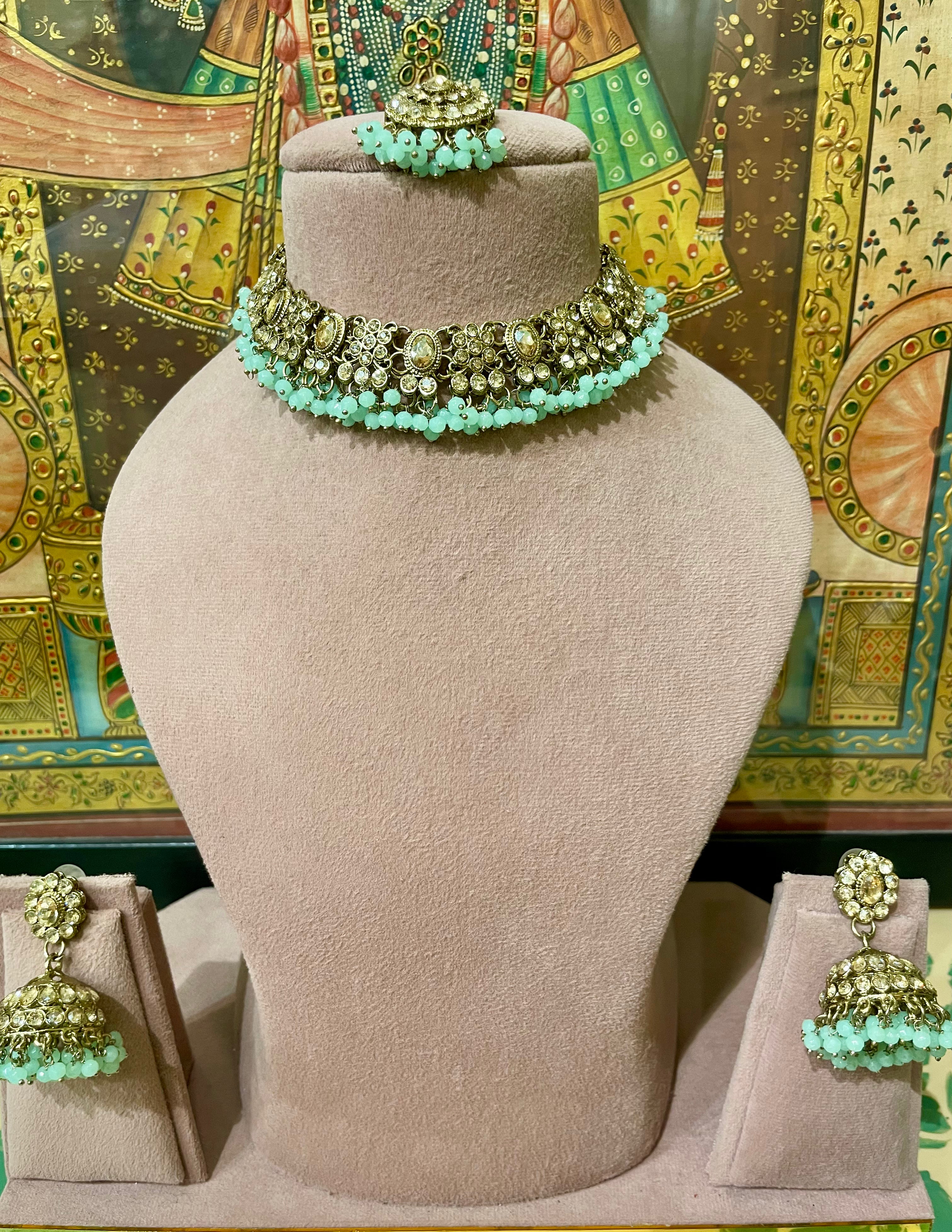 MINT GREEN GOLD TONED LIGHT NECKLACE SET