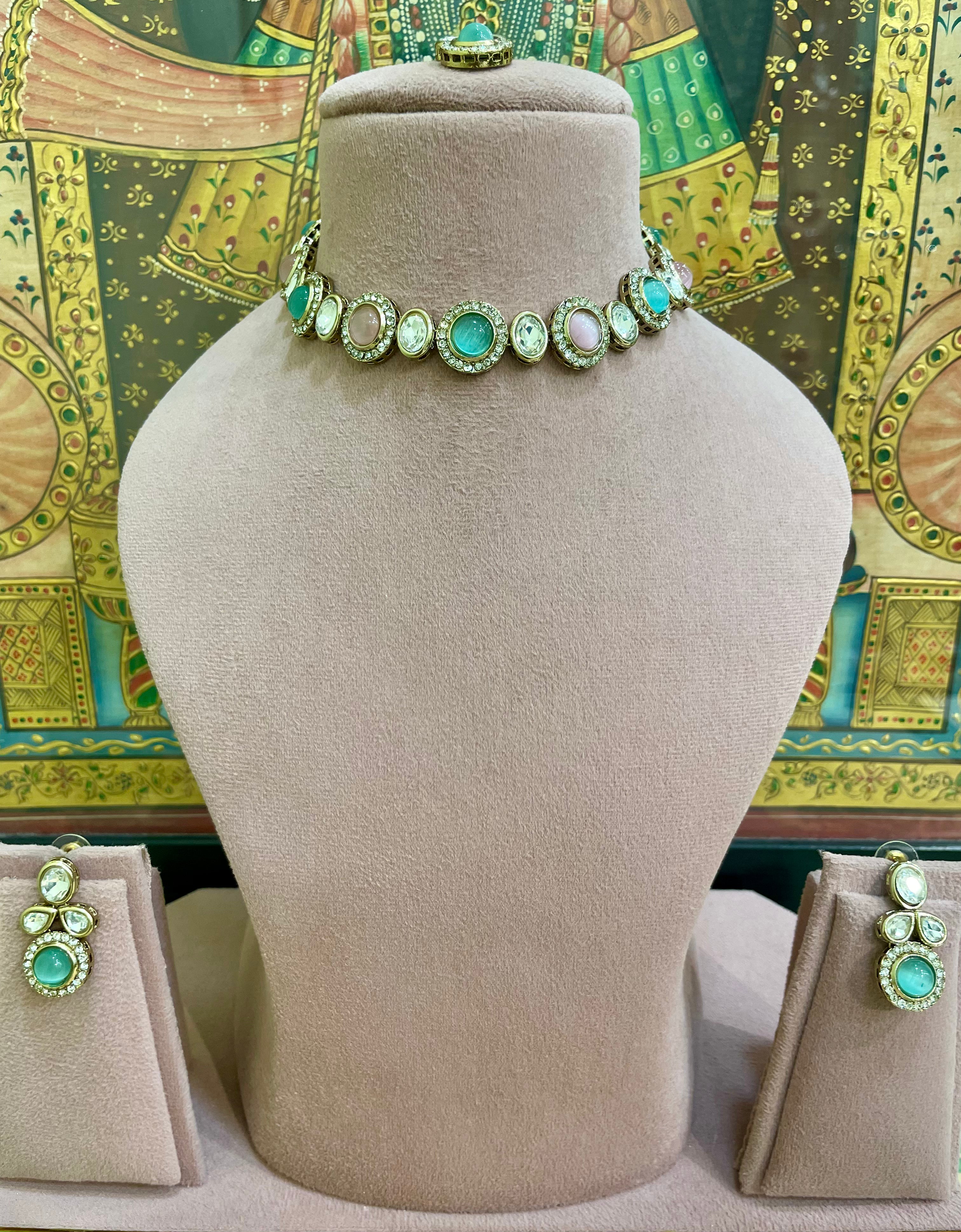 MINT GREEN & SOFT PINK KUNDAN MOISSANITE SLEEK NECKLACE SET