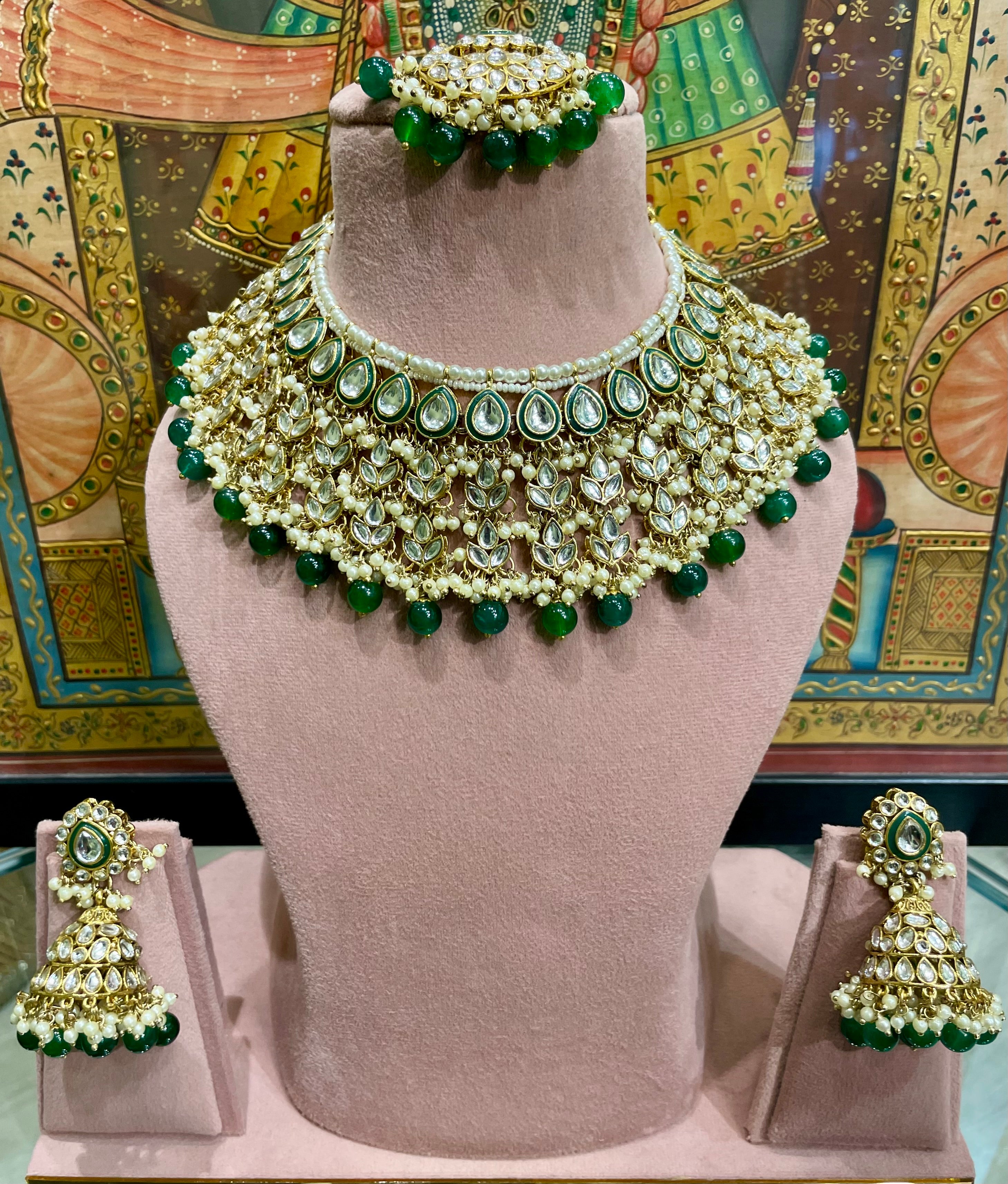 POLKI KUNDAN GOLD TONED BRIDAL NECKLACE SET (GREEN)