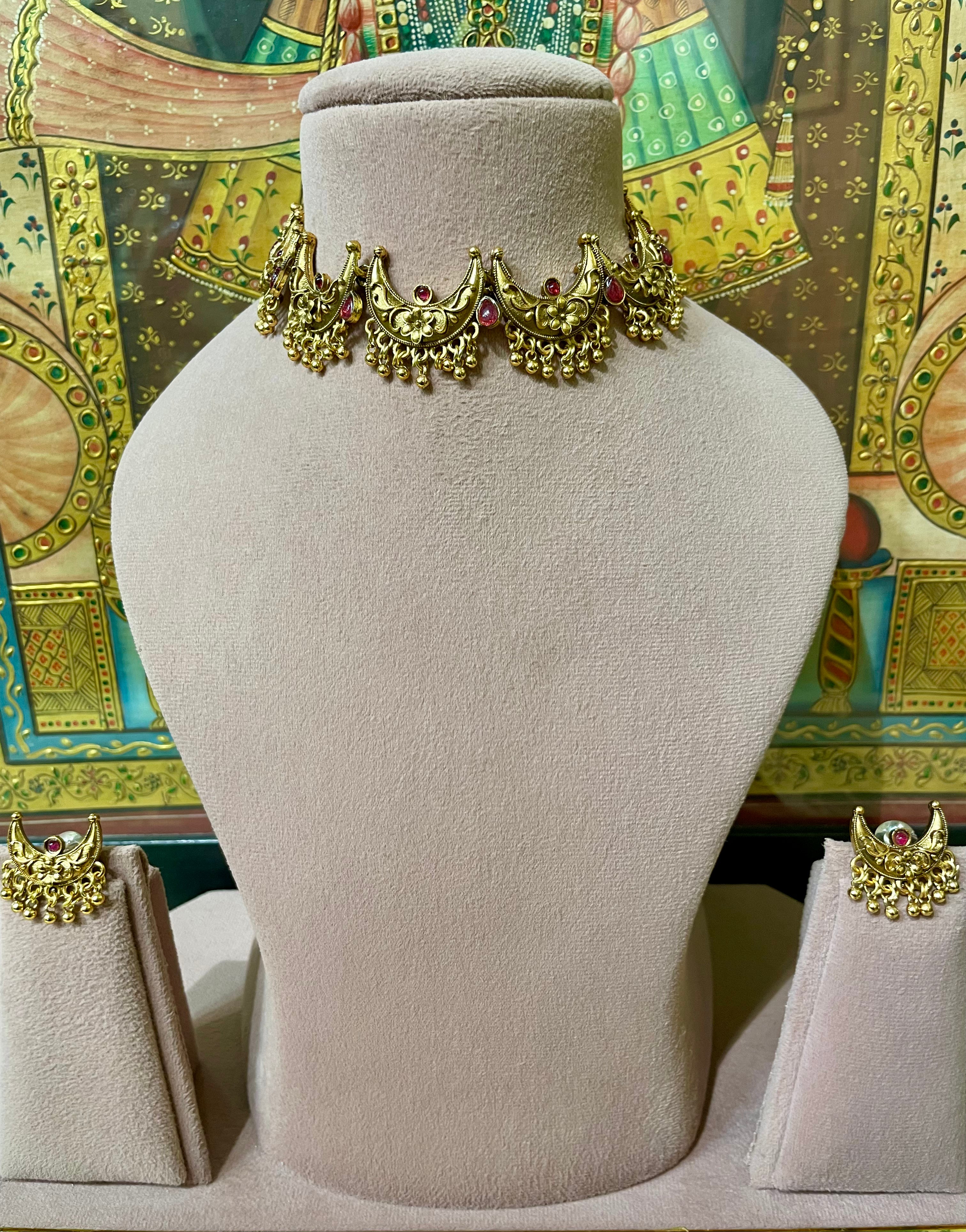RED KEMP STONES VINTAGE GOLD PLATED SOUTH INDIAN SET