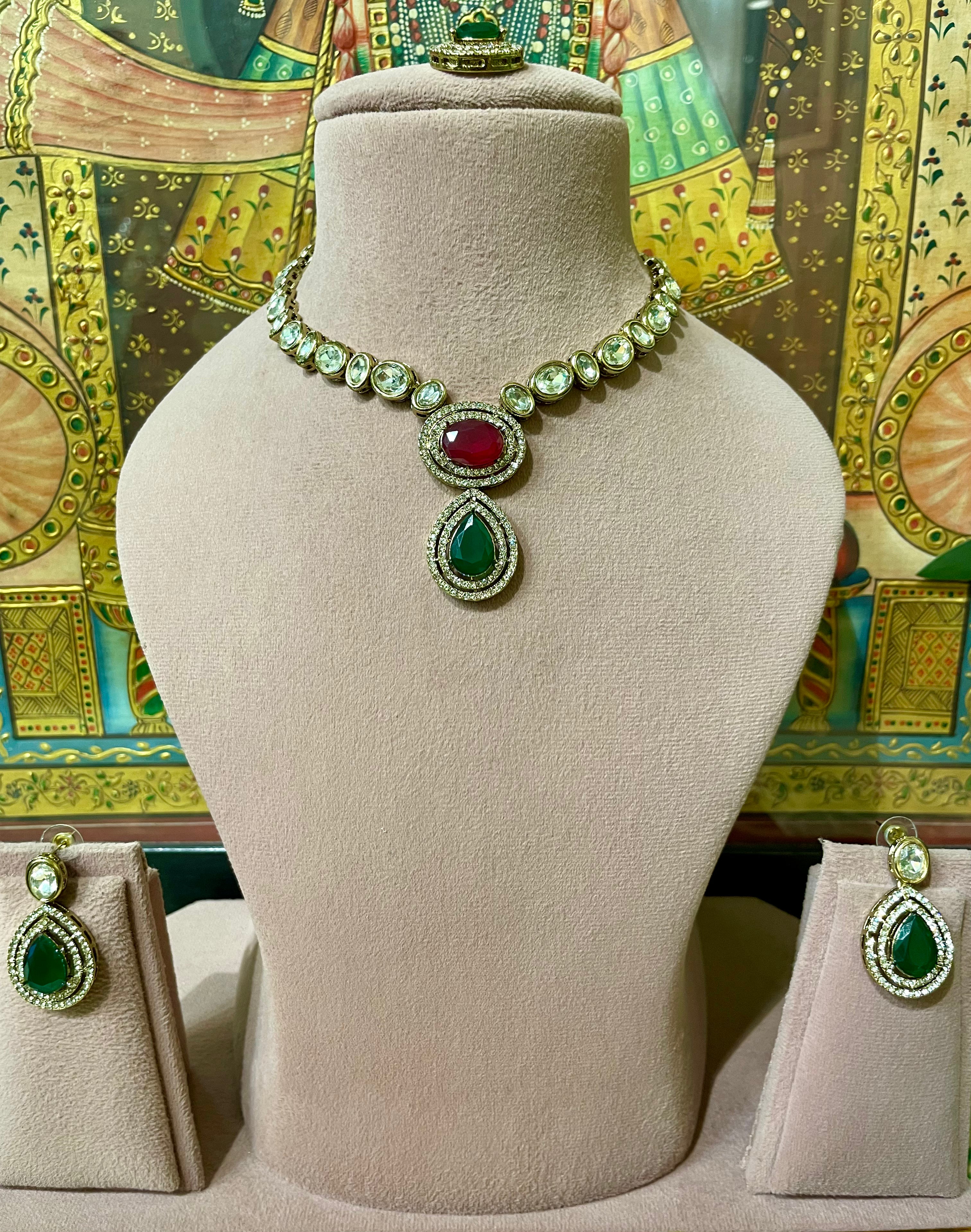 RUBY RED & GREEN KUNDAN MOISSANITE PENDANT NECKLACE SET