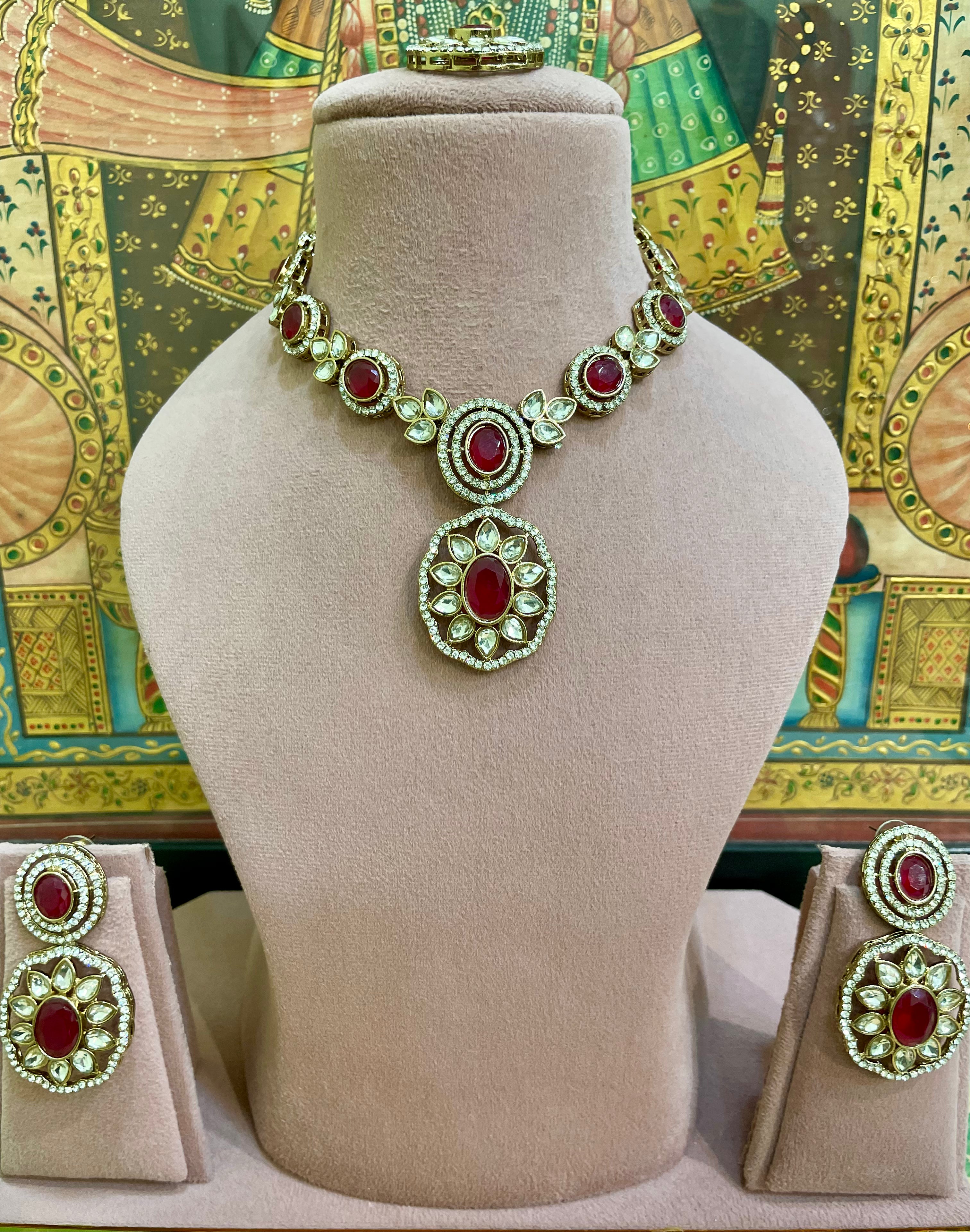 RUBY RED KUNDAN MOISSANITE FLORAL PENDANT DESIGNER NECKLACE SET