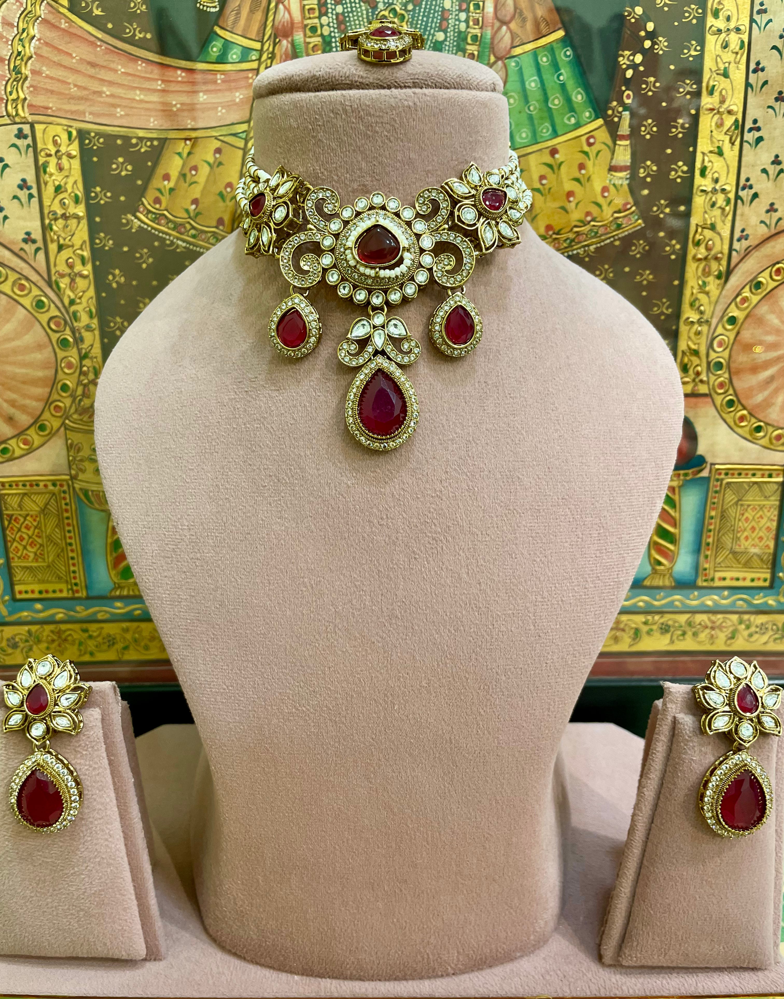 RUBY RED KUNDAN MOISSANITE MONALISA TEAR DROP DESIGNER CHOKER SET
