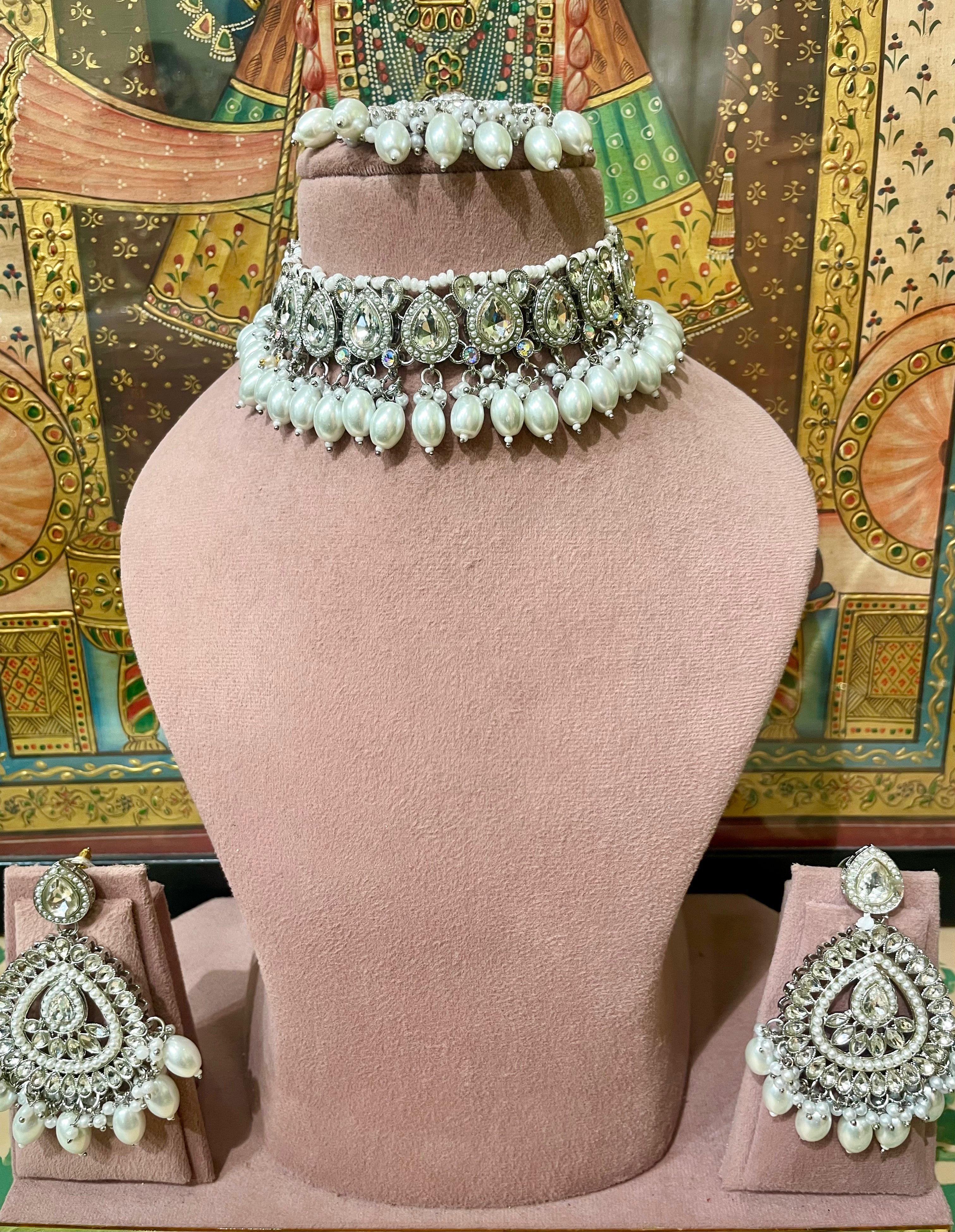 SILVER TONED IVORY WHITE PEARL DESIGNER CHOKER NECKLACE SET