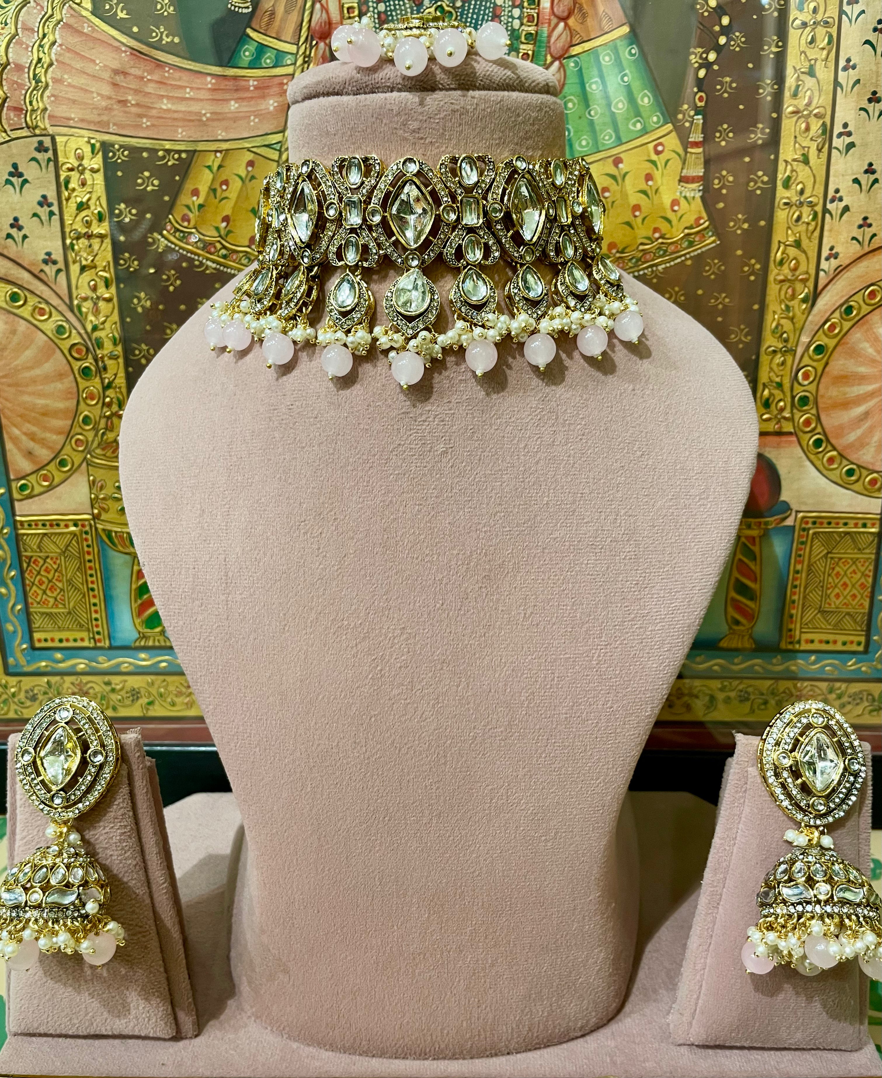 SOFT PINK GOLD PLATED KUNDAN MOISSANITE BRIDAL CHOKER SET