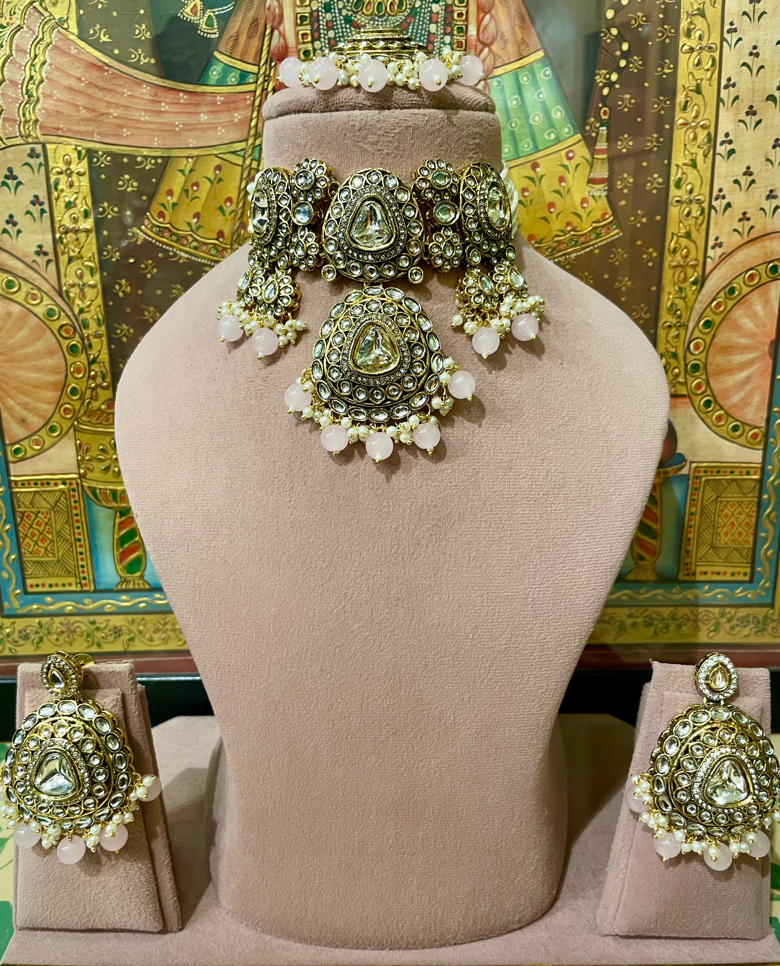 SOFT PINK GOLD PLATED NIZAM KUNDAN BRIDAL CHOKER SET