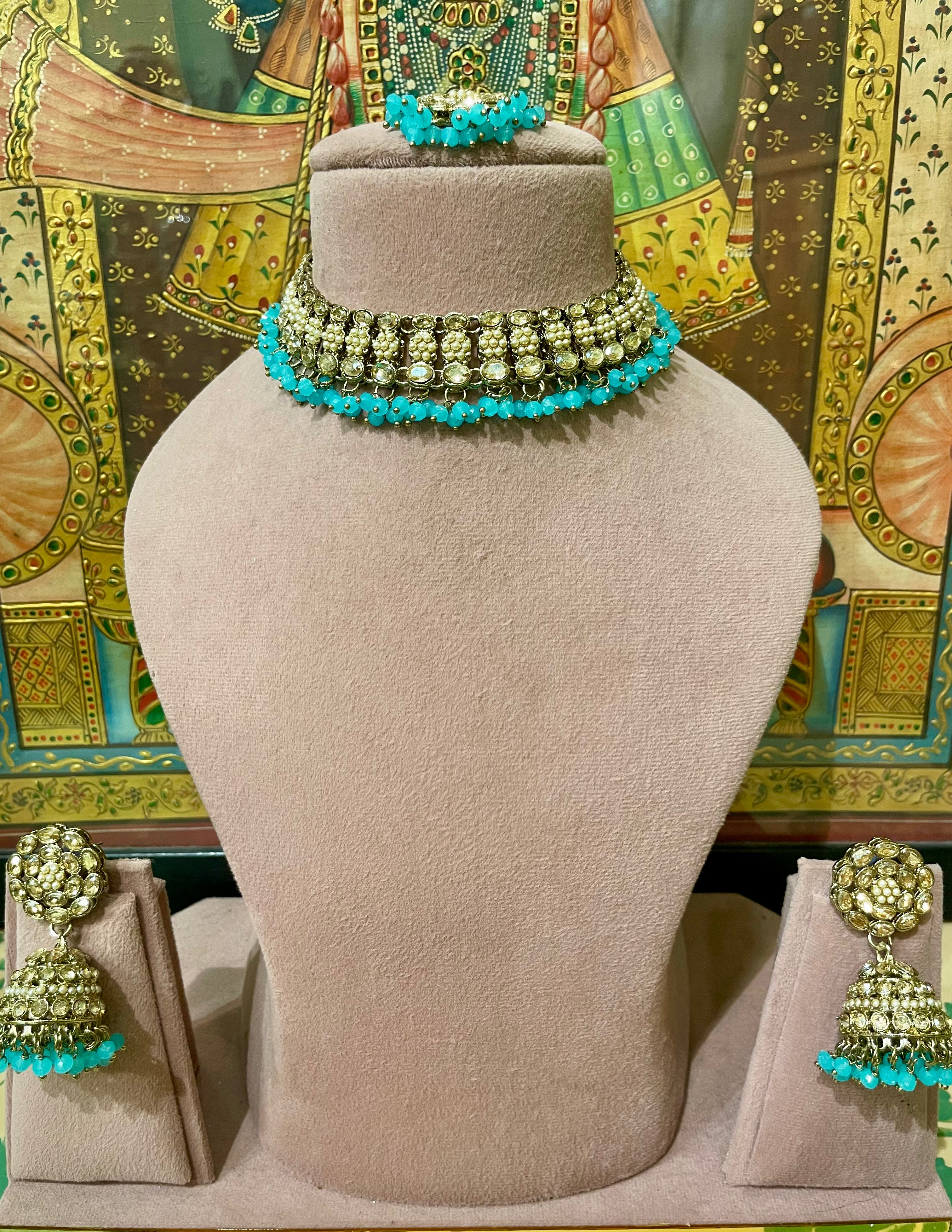 TURQUOISE GOLD TONED CHOKER NECKLACE SET