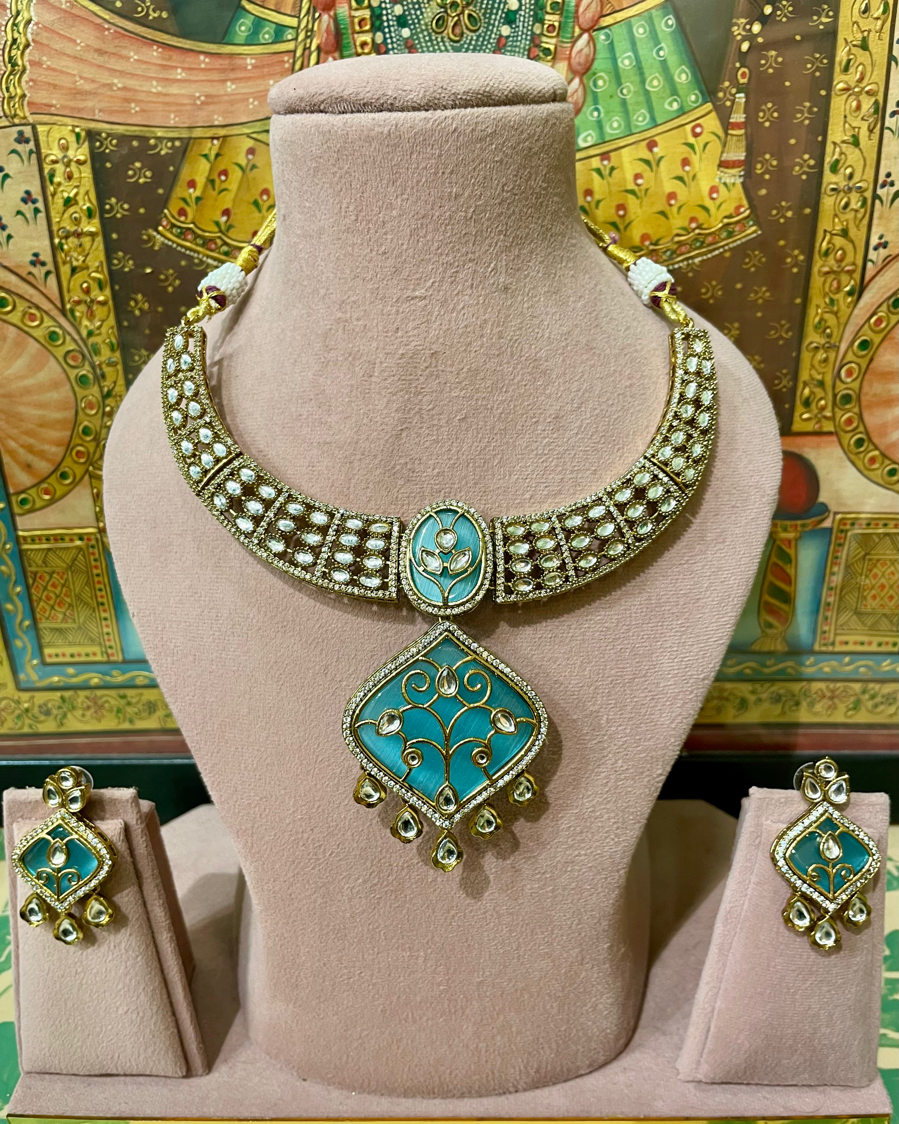VINTAGE POLKI GOLD TONED MONALISA STONE HASLI NECKLACE SET