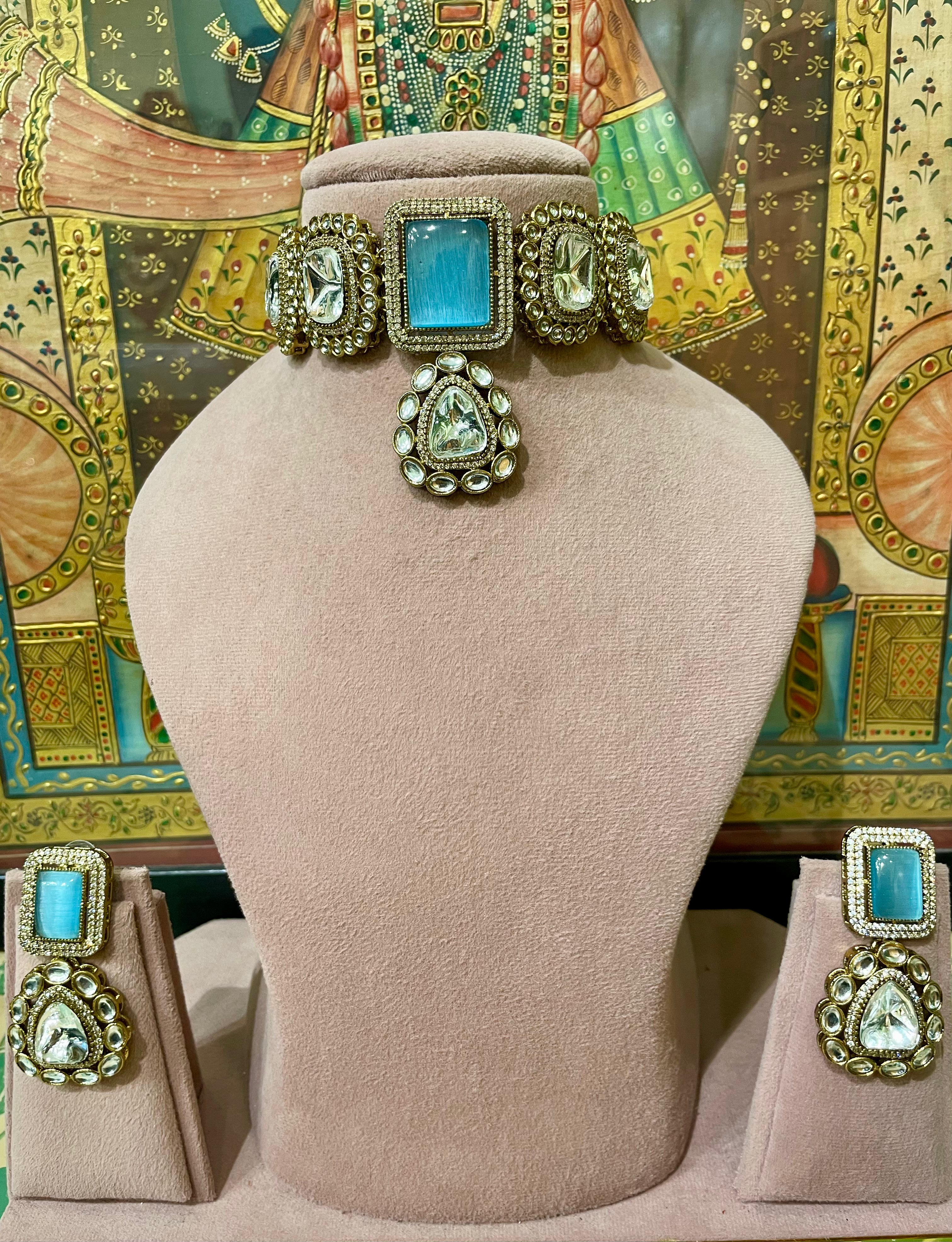 BLUE MONALISA STONE KUNDAN NIZAM CHOKER NECKLACE SET