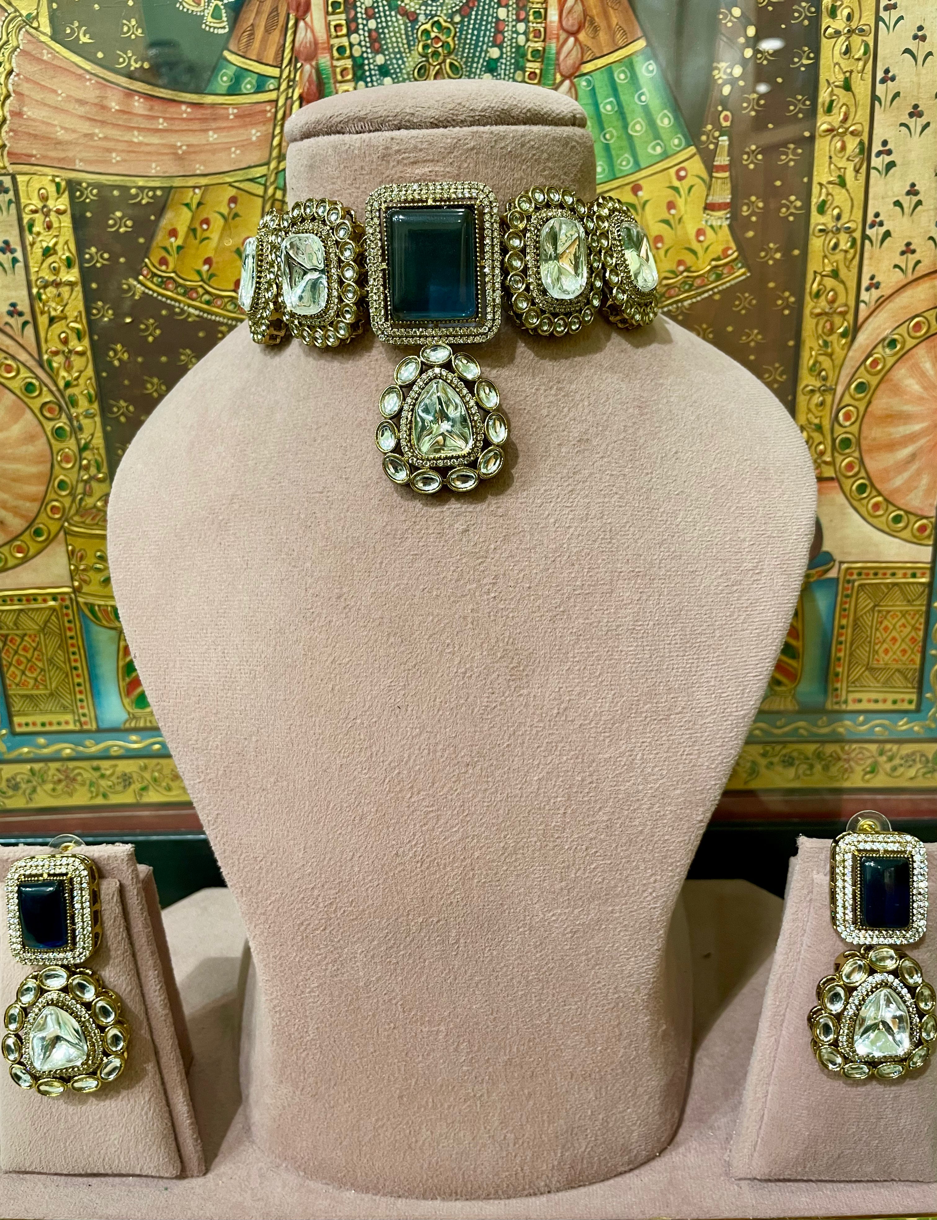 DARK BLUE NIZAM ANTIQUE KUNDAN MONALISA STONE CHOKER SET