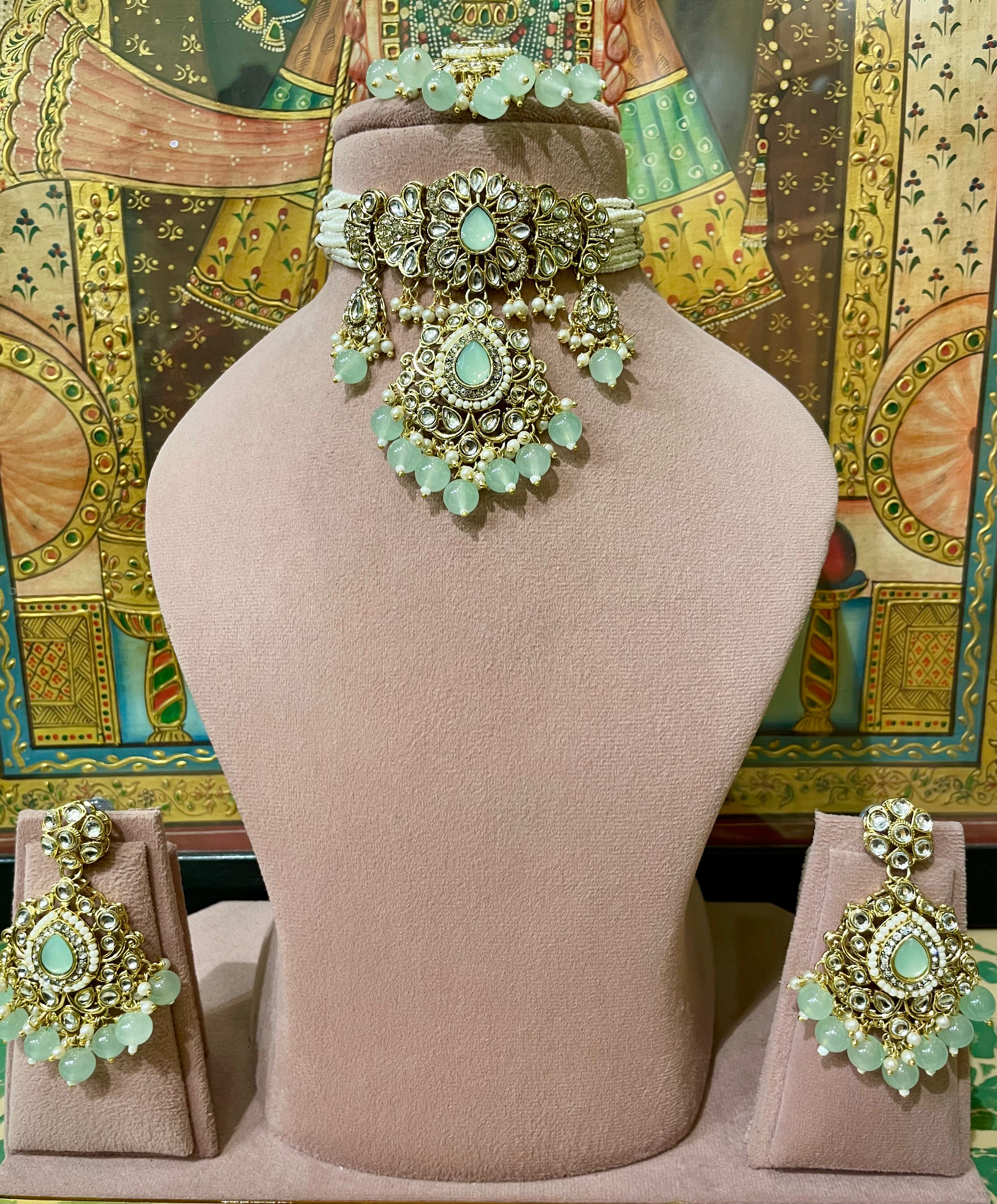 MINT GREEN KUNDAN GOLD PLATED ETHNIC CHOKER SET
