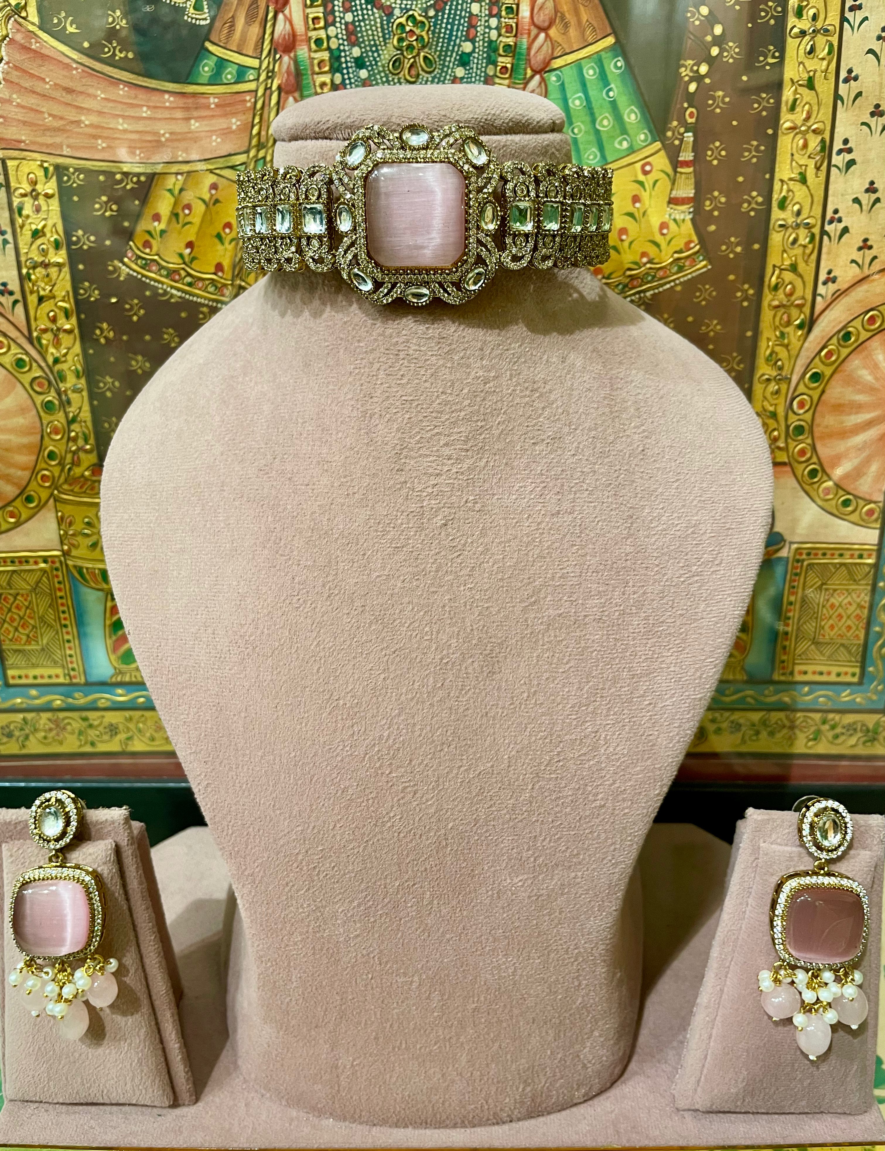 PINK MONALISA STONE KUNDAN INDO WESTERN CHOKER SET