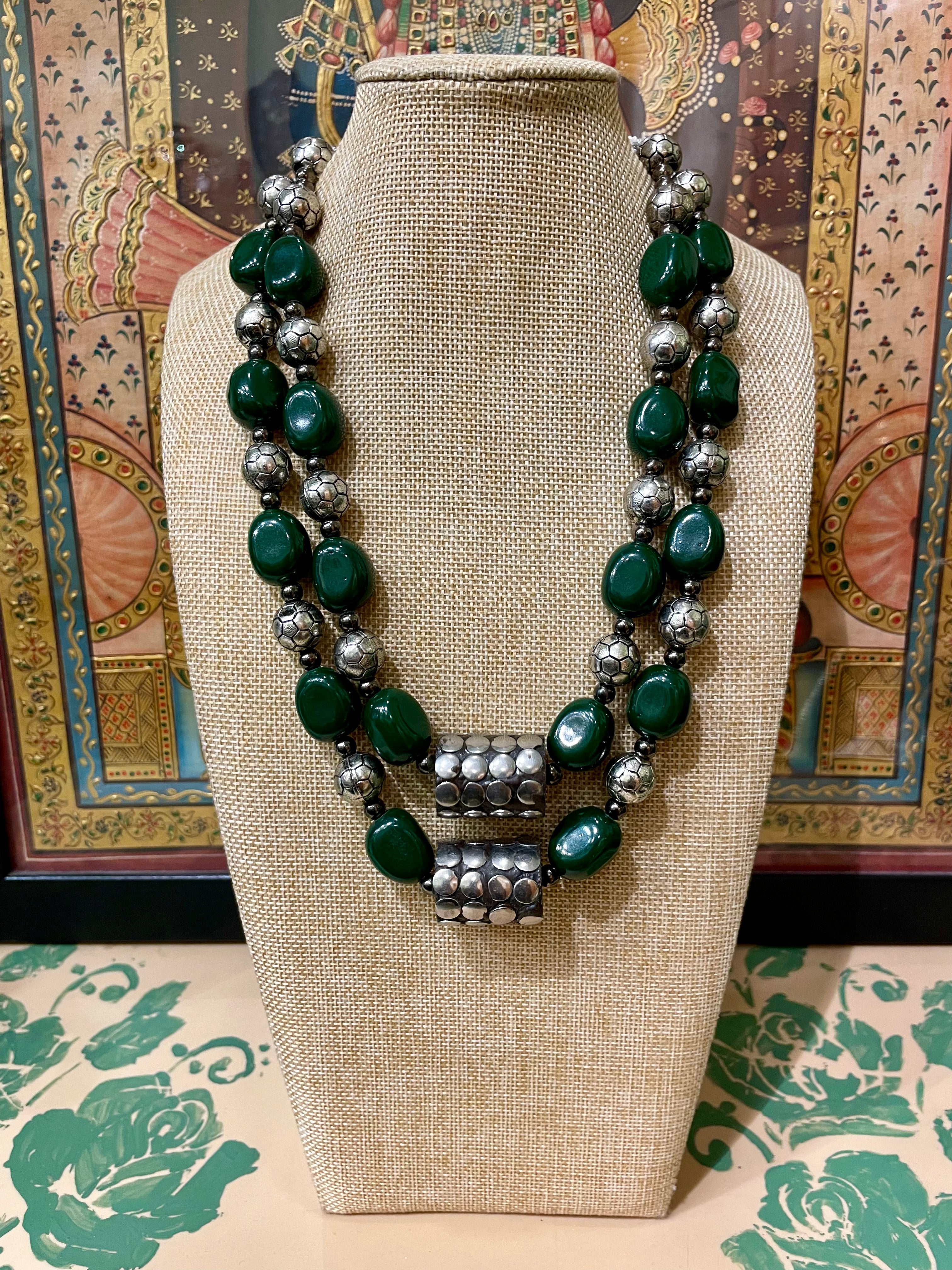 GREEN ONYX WITH OXIDISED SILVER BEADS DOUBLE LAYER NECKLACE