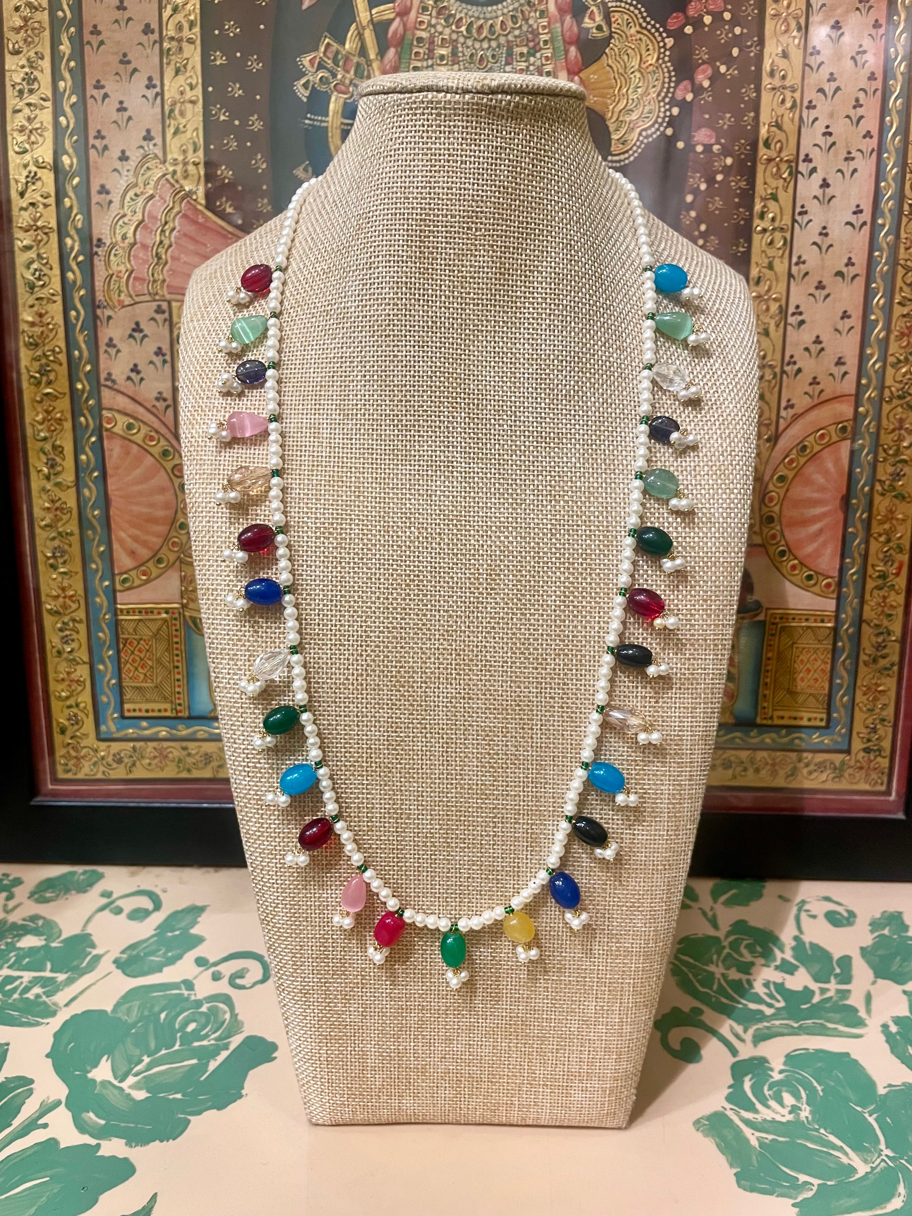 LONG PEARL MULTI COLOUR STONES NECKLACE