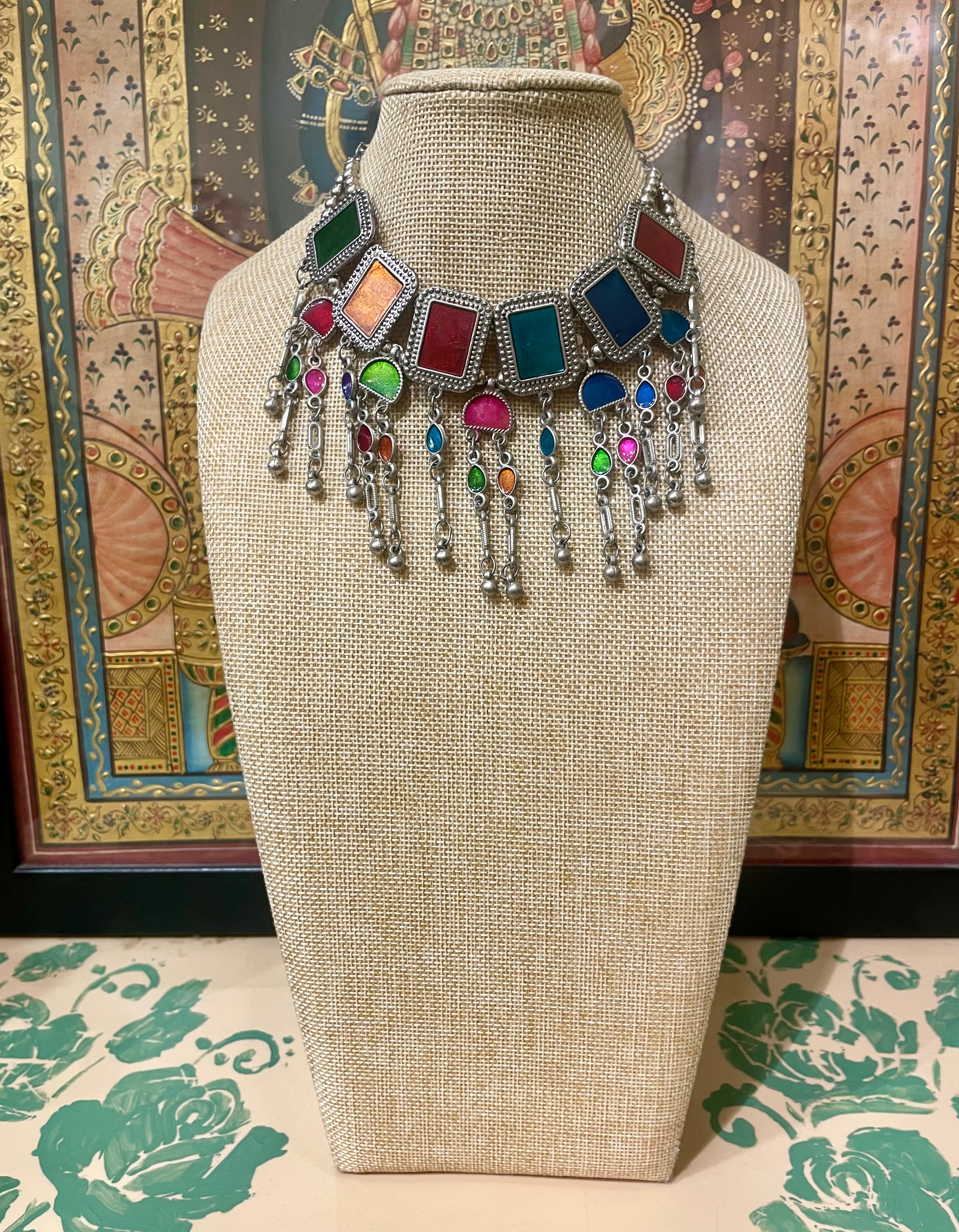 OXIDISED SILVER MULTI COLOURED GLASS DESIGNER NECKLACE