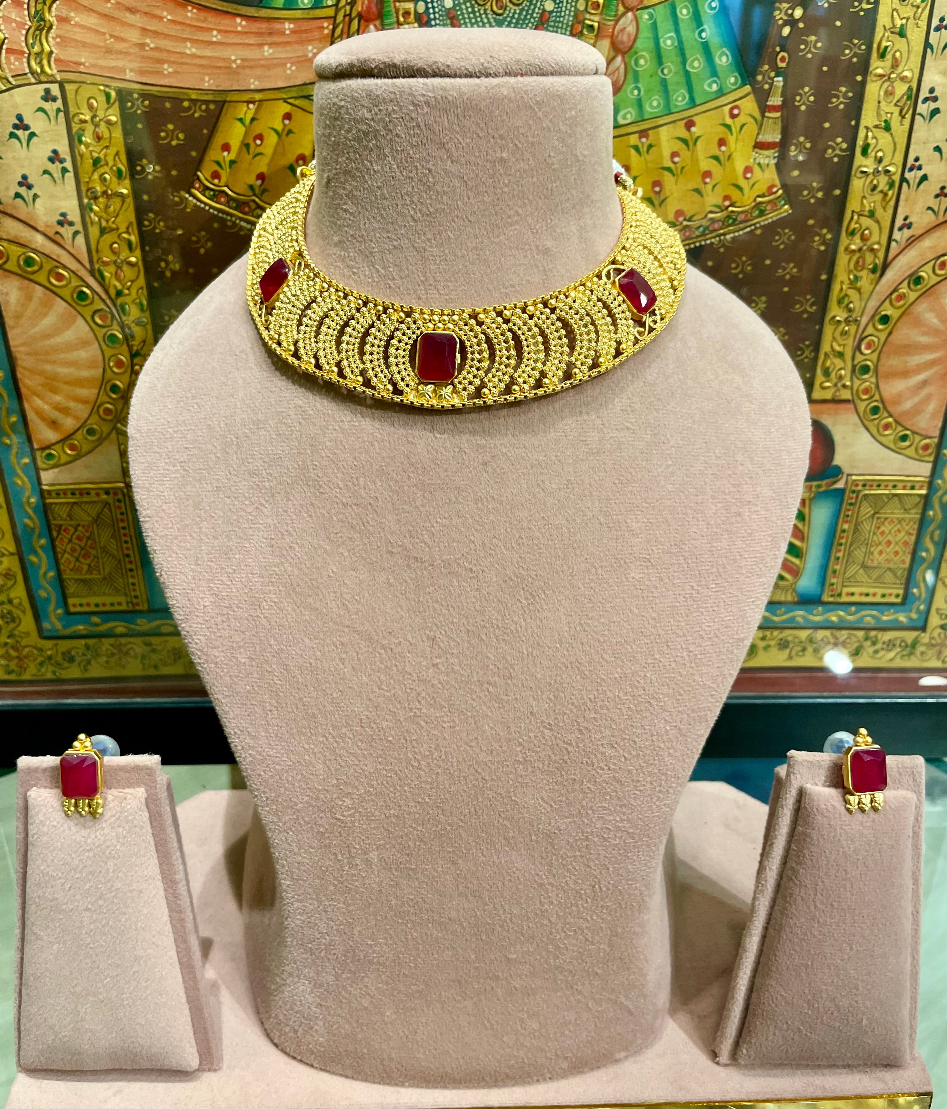 GOLD TONED RED KEMP STONE STUDDED SOUTH INDIAN NECKLACE SET