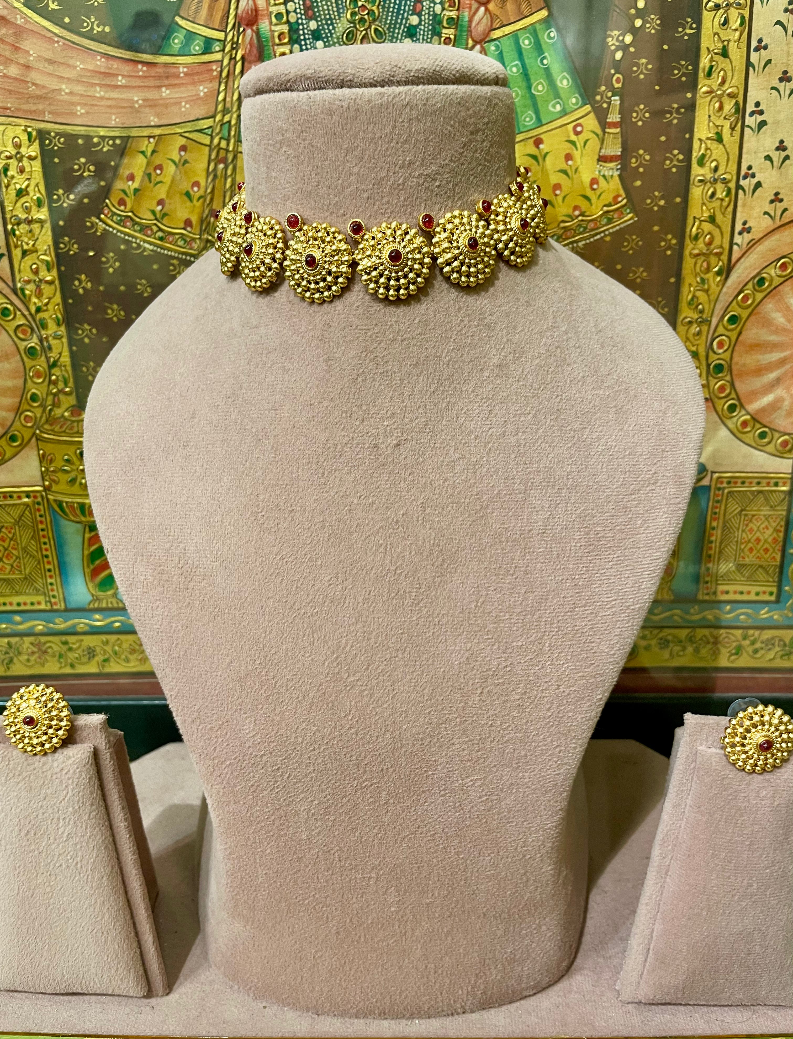 GOLD TONED ROUND SOUTH INDIAN CHOKER SET (RED)