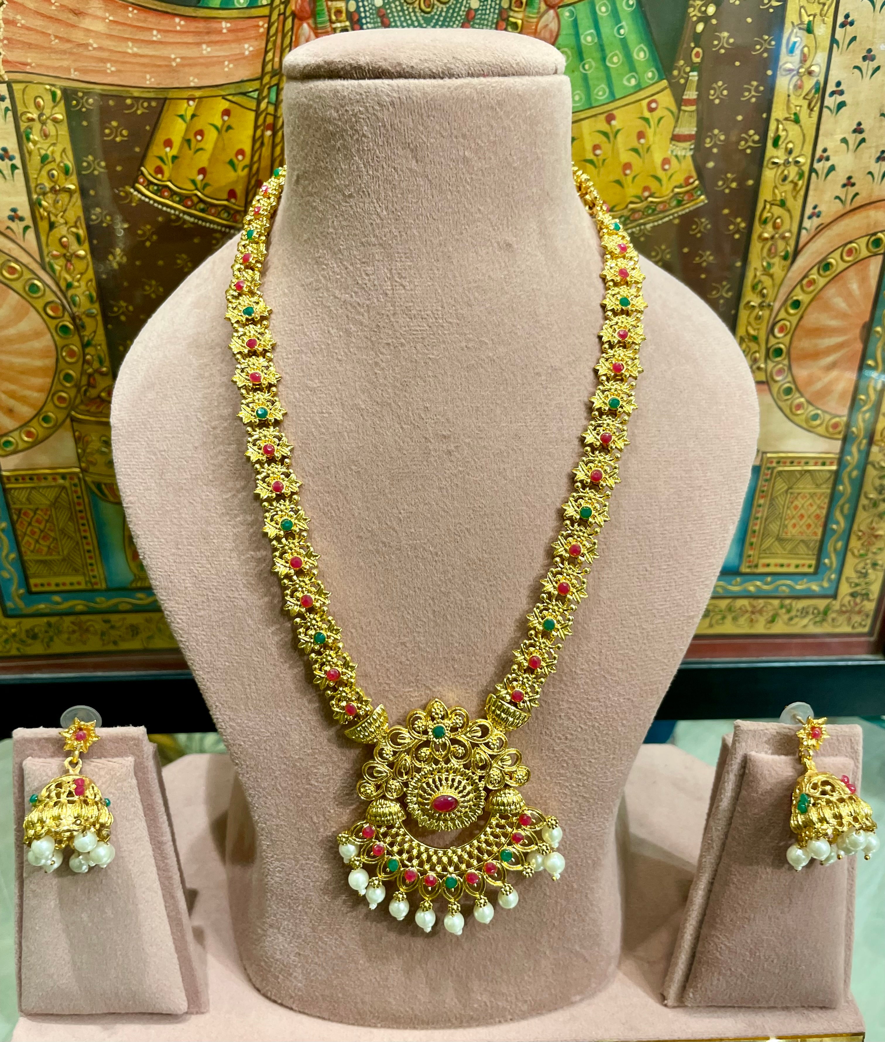 GOLD TONED SOUTH INDIAN LONG PENDANT NECKLACE SET
