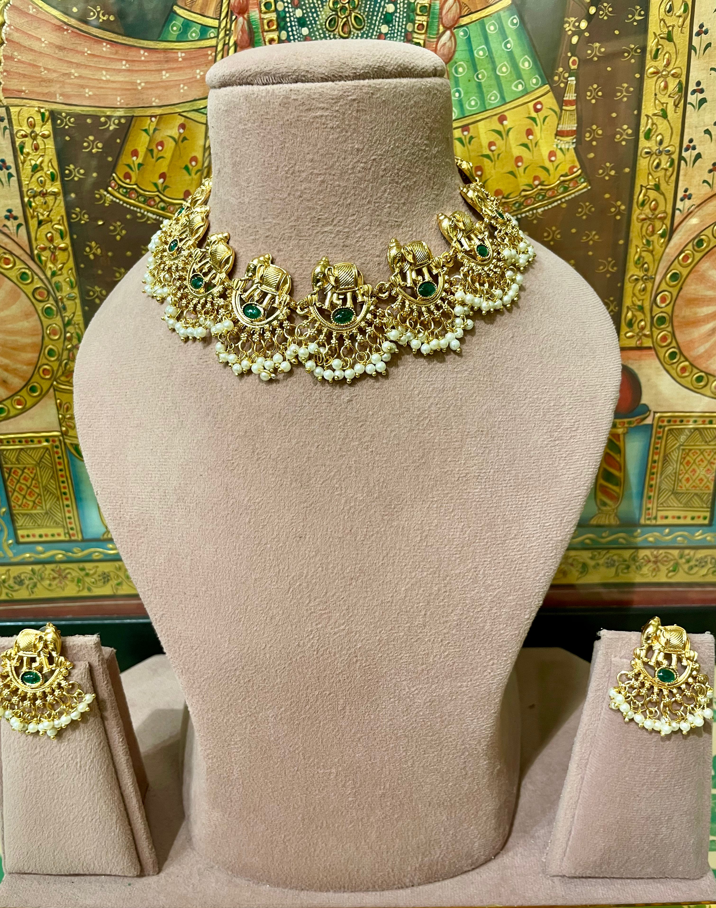 GREEN TRADITIONAL SOUTH INDIAN GOLD PLATED PEARL NECKLACE SET