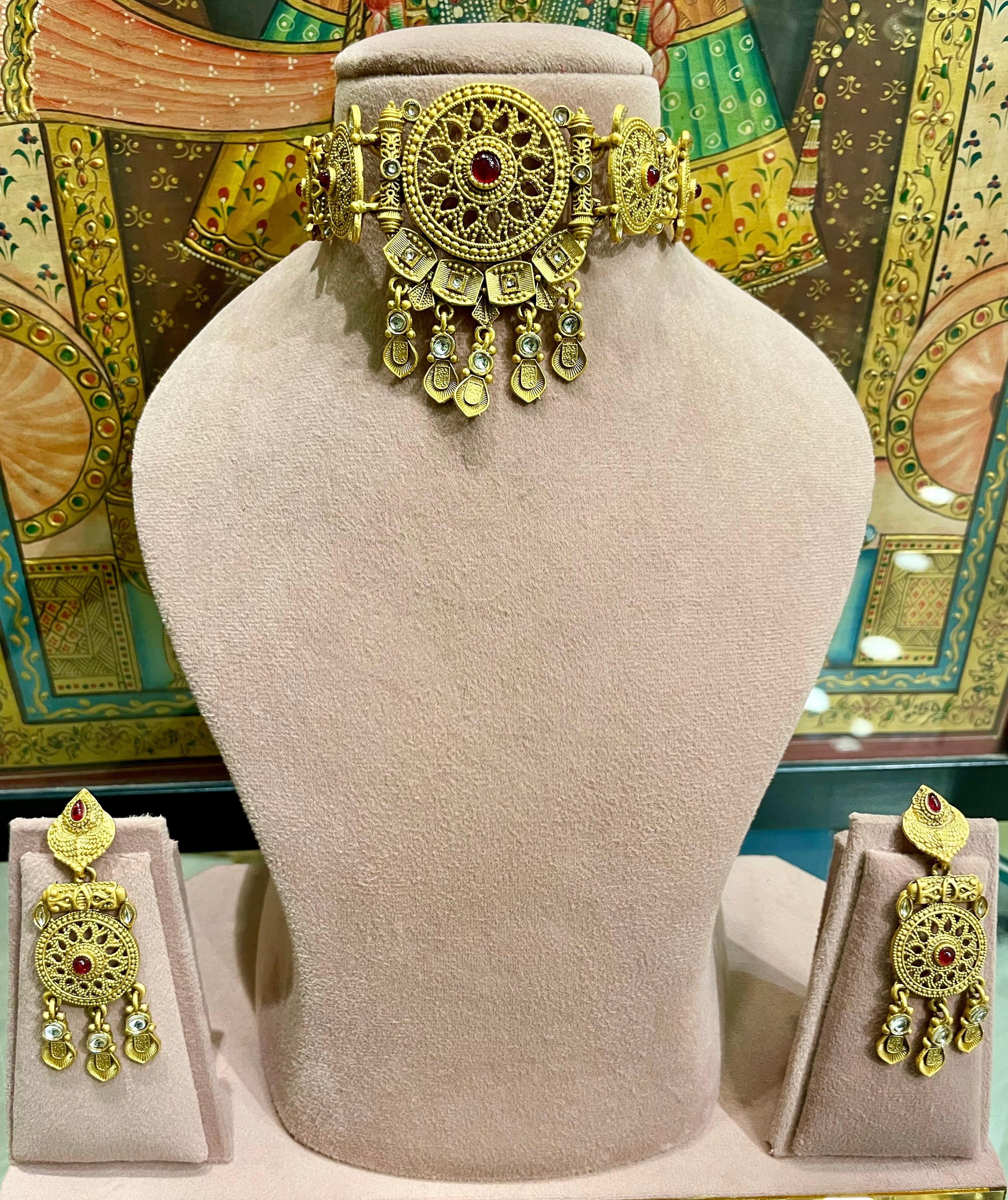 RAJWADI ROUND MATT FINISH CHOKER NECKLACE SET (RED)
