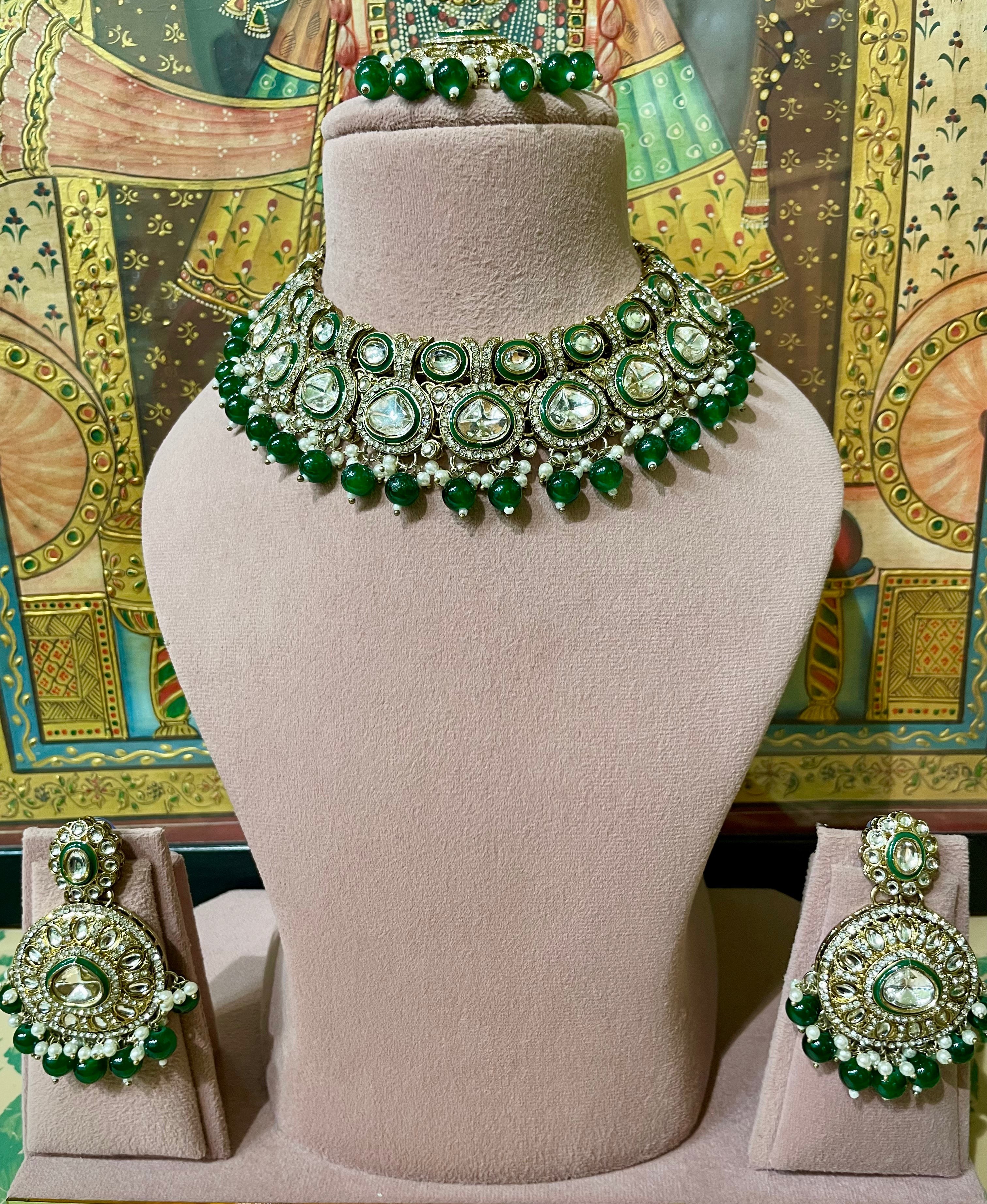 GREEN KUNDAN MOISSANITE BRIDAL NECKLACE SET