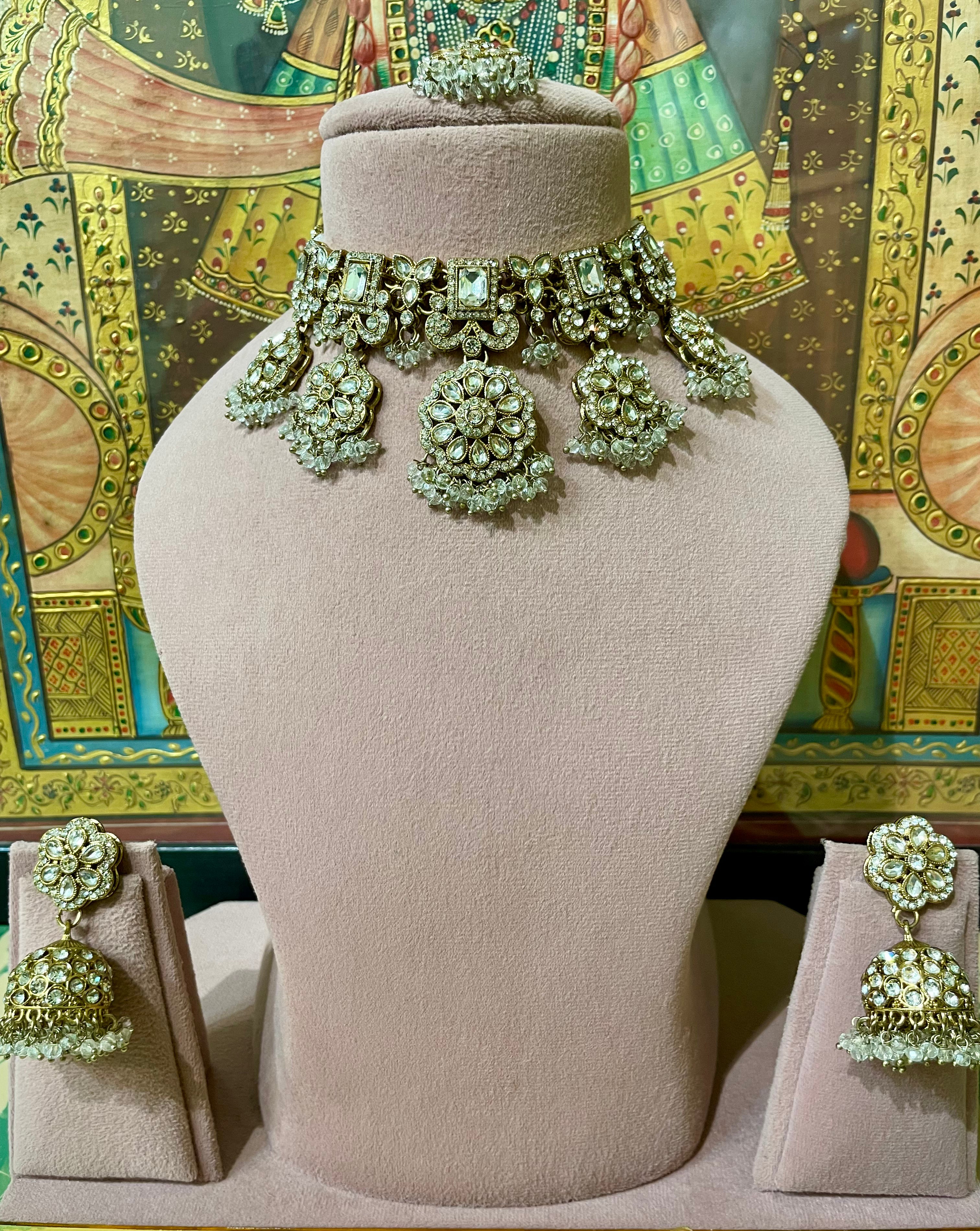 KUNDAN MOISSANITE PENDANT CHOKER JHUMKI SET