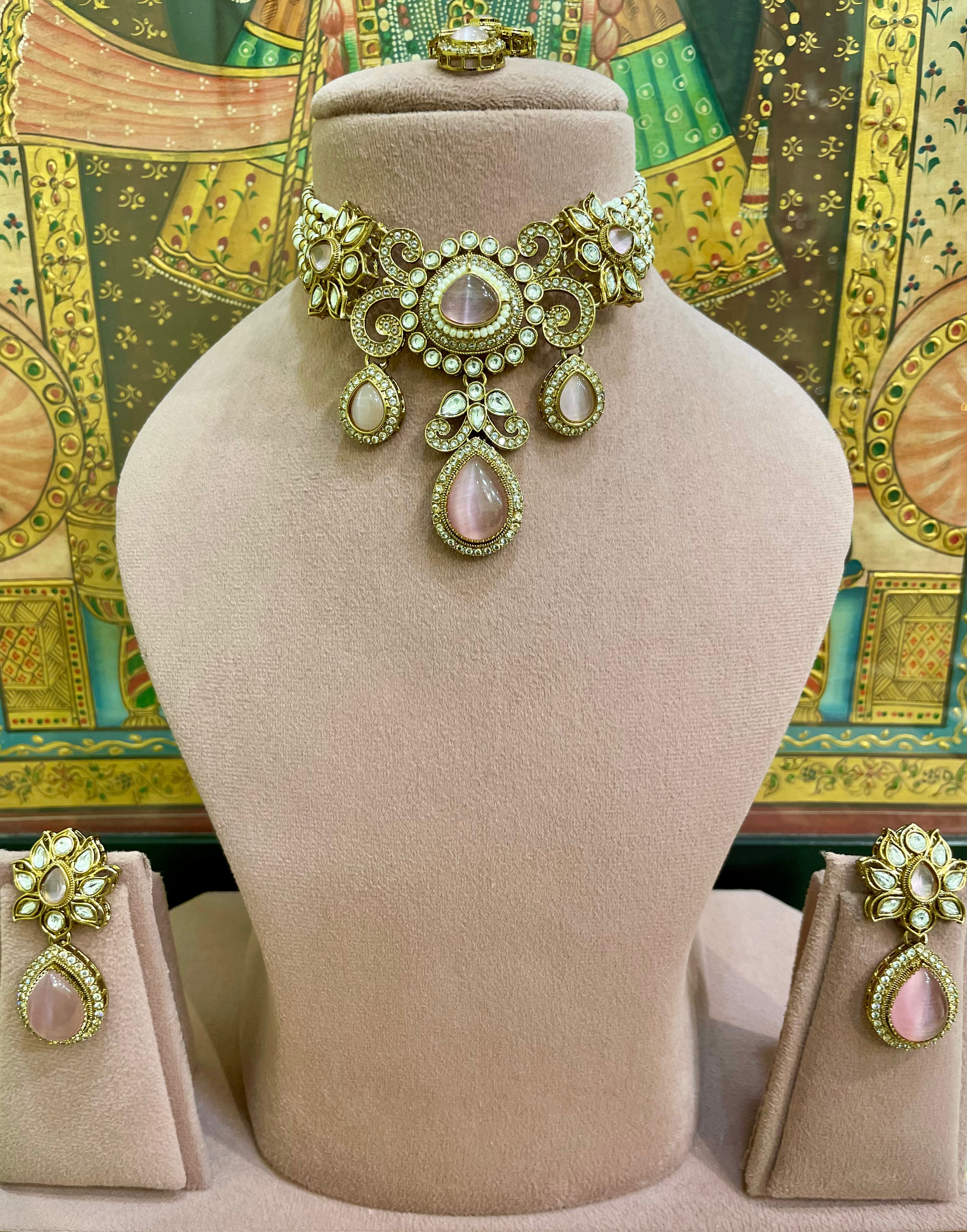 SOFT PINK KUNDAN MOISSANITE MONALISA TEAR DROP DESIGNER CHOKER SET