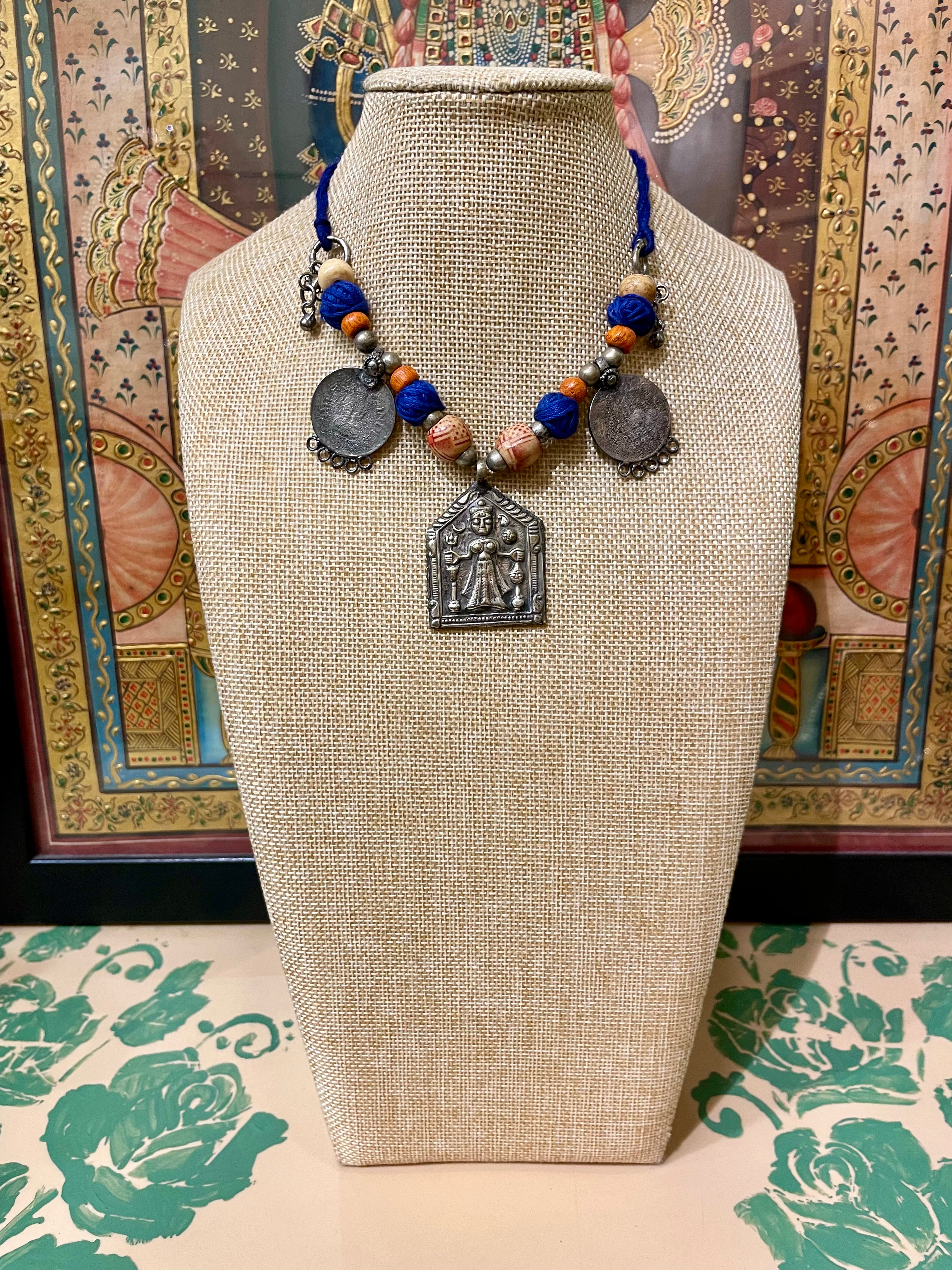TRIBAL OXIDISED SILVER COIN NECKLACE (BLUE)